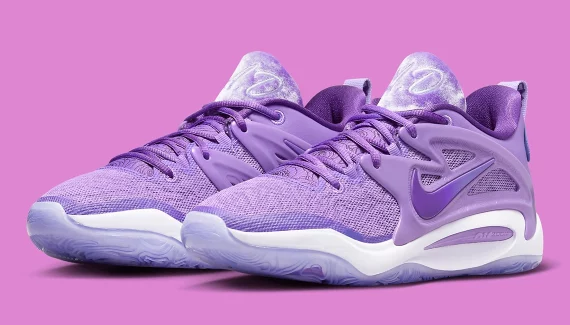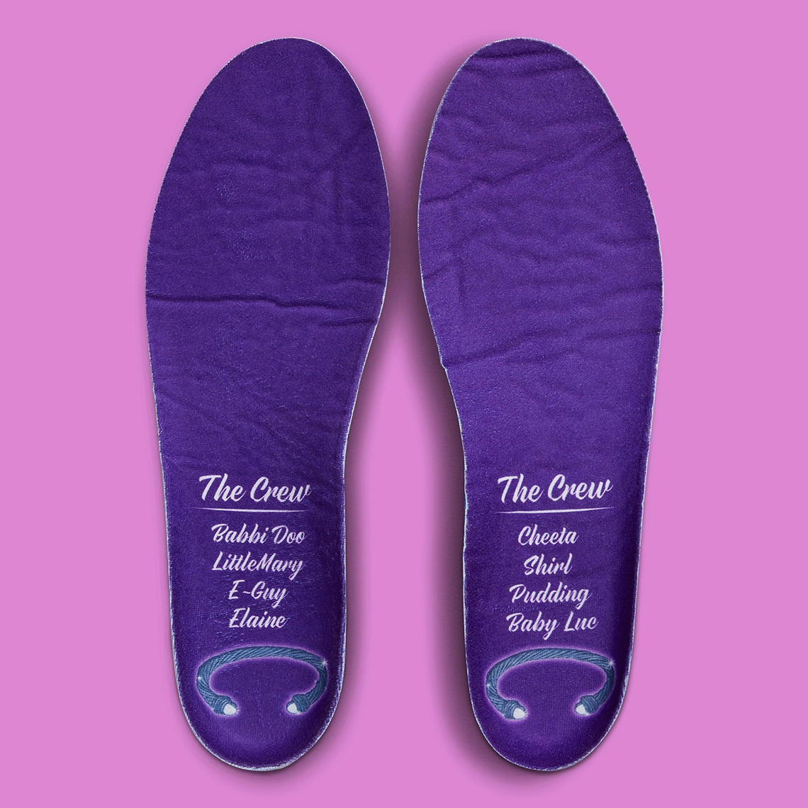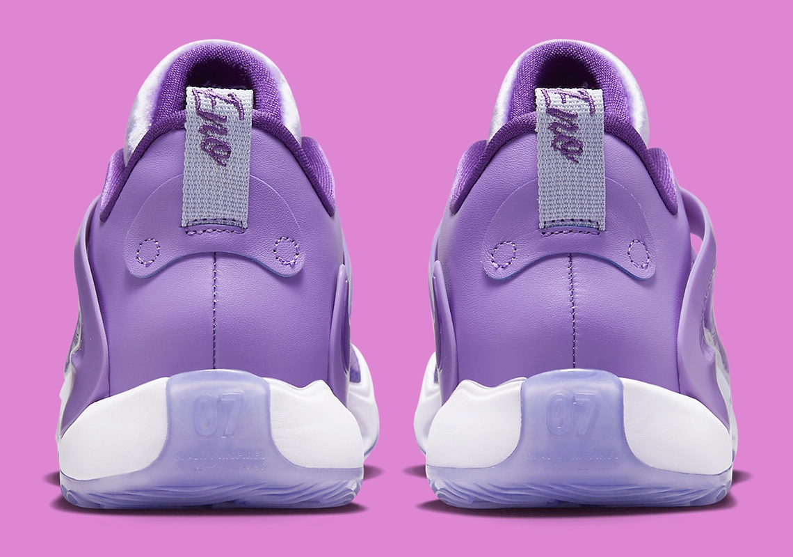 Après la version « Pearl », du nom de sa tante décédée d’un cancer, c’est un coloris « B.A.D. » en l’honneur de sa grand-mère qui a été conçu. On retrouve une tige alliant deux teintes de violet et accompagnée par une languette également violette, mais en velours. L’ensemble repose sur une semelle blanche et translucide.