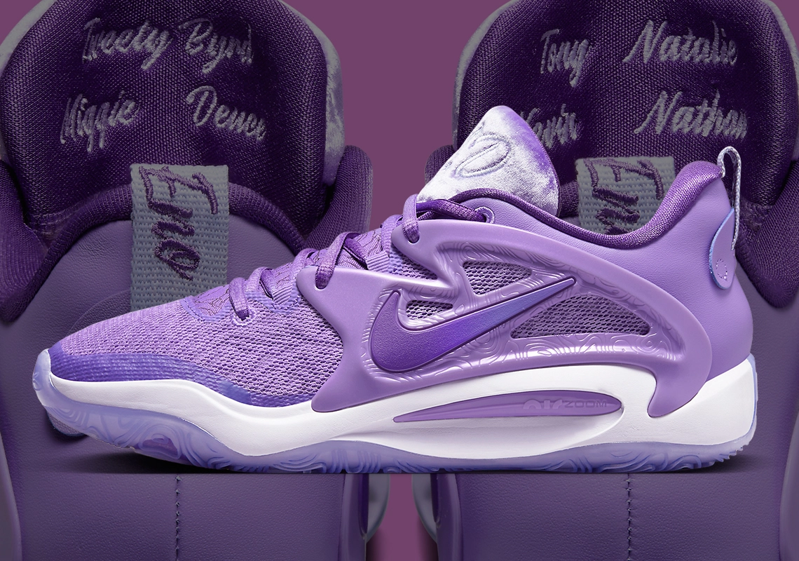 Les prénoms des petits enfants de la grand-mère de Kevin Durant, Tweety Byrd, Miggie, Deuce, Tony, Natalie, Nathan et Kevin figurent également sur la semelle intérieure.