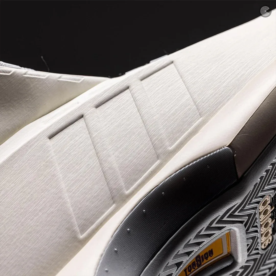 La tige teintée en blanc nacrée et cette fois accompagnée d’une languette « Purple ». On trouve quelques finitions en jaune au niveau du talon et sous la semelle extérieure grise.