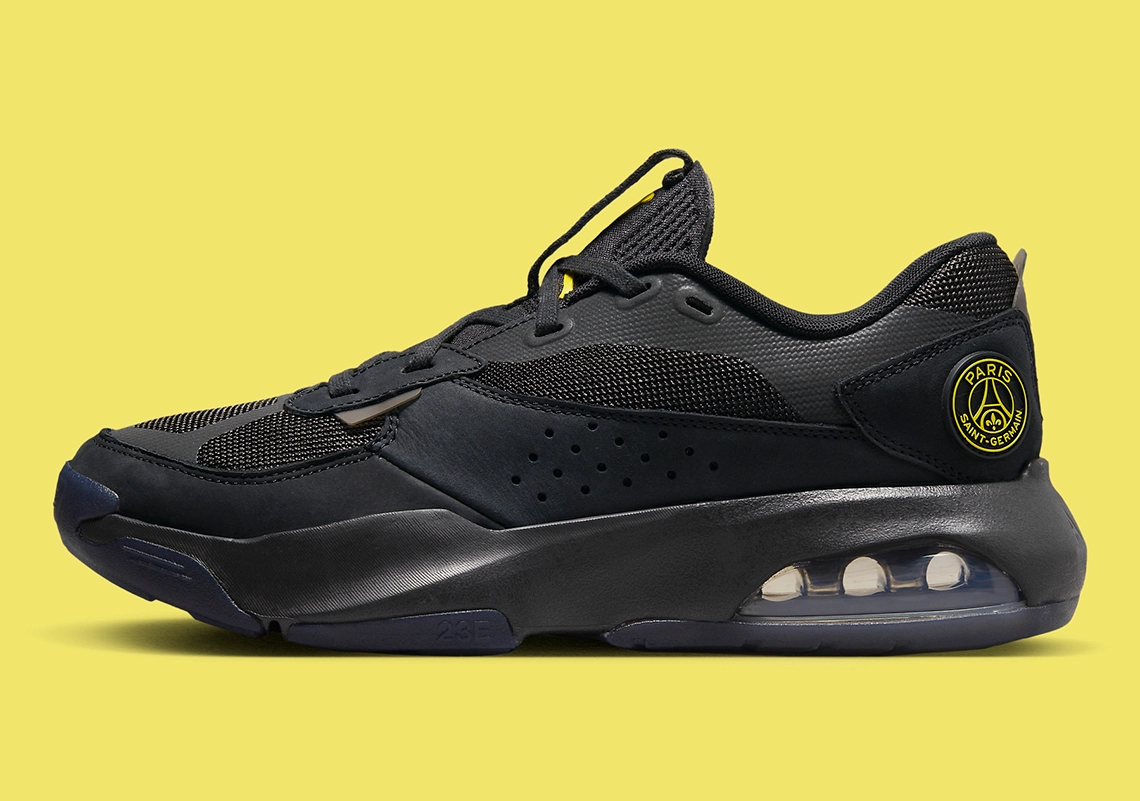 Le partenariat entre Jordan Brand et le PSG a pris une nouvelle envergure avec l’arrivée de la prochaine Jordan Air 200E x PSG. Le modèle à la tige noire et à la semelle extérieure en bleu foncé est en effet estampillé du logo du club parisien, en jaune, au niveau du talon et de la semelle intérieure.