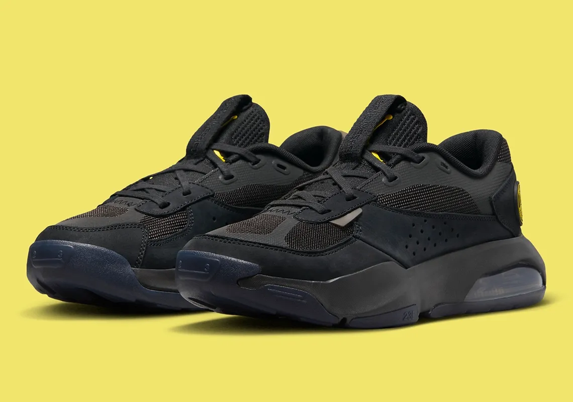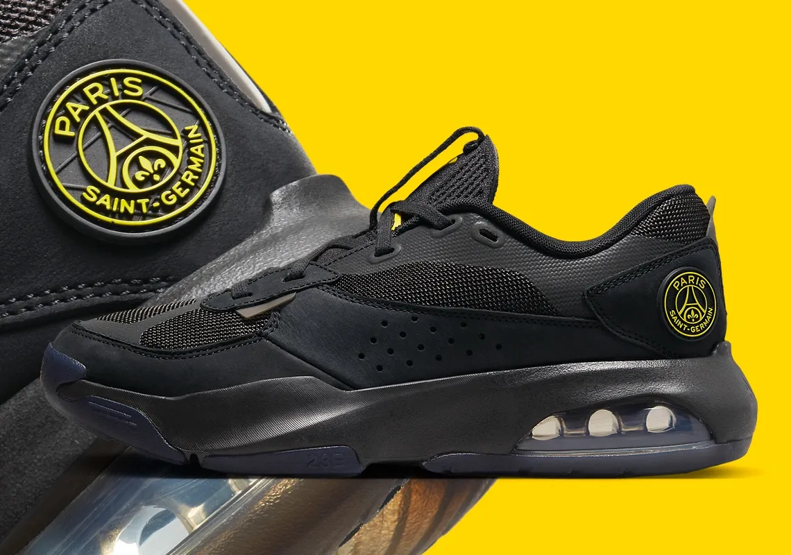 Le partenariat entre Jordan Brand et le PSG a pris une nouvelle envergure avec l'arrivée de la prochaine Jordan Air 200E x PSG. Le modèle à la tige noire et à la semelle extérieure en bleu foncé est en effet estampillé du logo du club parisien, en jaune, au niveau du talon et de la semelle intérieure.