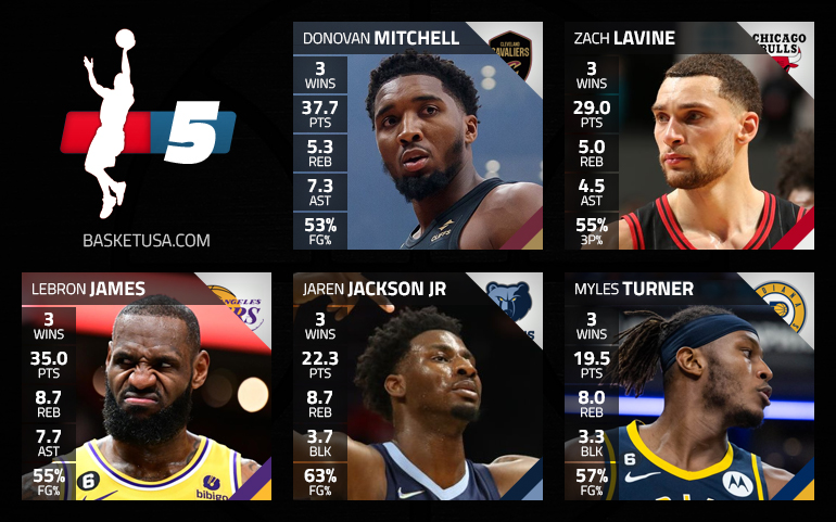 Même si Jalen Brunson, Luka Doncic et Shai Gilgeous-Alexander étaient des options, impossible de laisser de côté Donovan Mitchell sur le “backcourt” du cinq de la semaine. À ses côtés à l’arrière, on opte pour Zach LaVine, qui semble retrouver son meilleur niveau et brille en particulier derrière la ligne à 3-points (55.3% de réussite !).