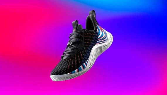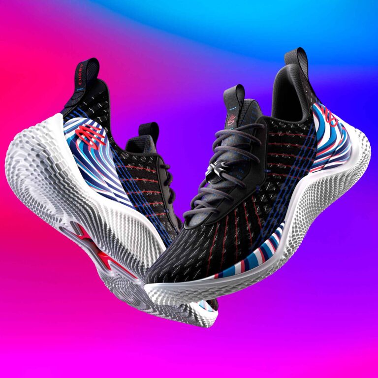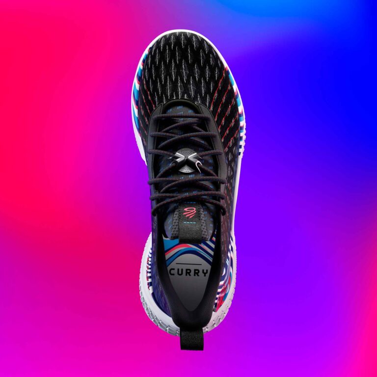 La magie de Stephen Curry se matérialise ici par une tige noire assorties de finitions blanches, bleues et rouges. On retrouve ce même assortiment à la base de la tige en complément d’une semelle extérieure UA Flow blanche. Le logo du joueur apparaît en rouge.
