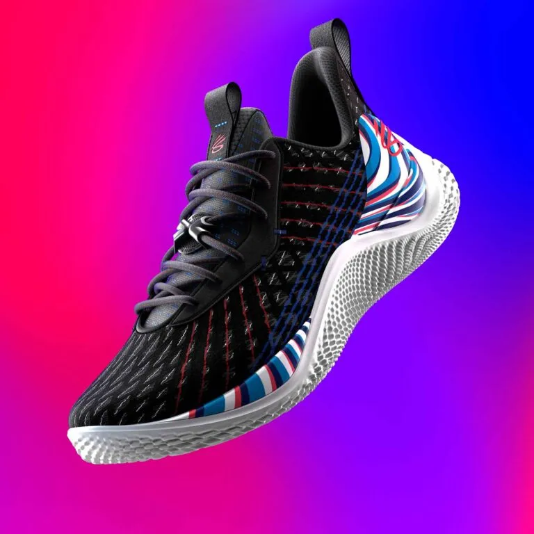 La magie de Stephen Curry se matérialise ici par une tige noire assorties de finitions blanches, bleues et rouges. On retrouve ce même assortiment à la base de la tige en complément d'une semelle extérieure UA Flow blanche. Le logo du joueur apparaît en rouge.