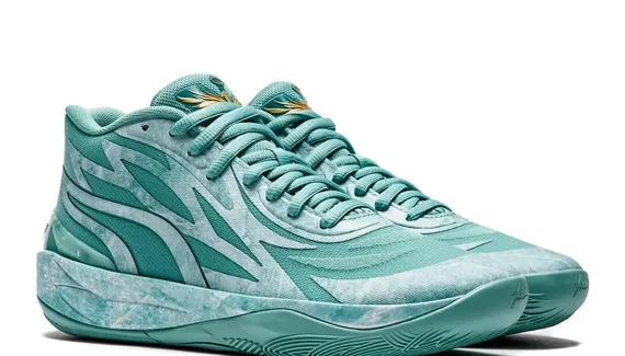 Le cinquième coloris de la MB.02 sera d’inspiration chinoise ! Alors que le nouvel an lunaire se profile, Puma a opté pour un coloris inspiré de la pierre de jade. La tige se distingue par un ensemble bleu turquoise agrémentée de touches « marbrées » sur les motifs d’aile, également agrémentées de doré, et d’un renfort en TPU vert clair au niveau du talon.