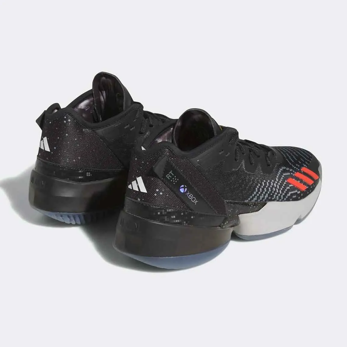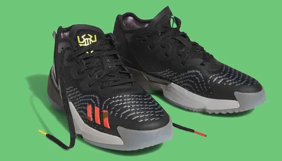 Le modèle de la chaussure signature de Donovan Mitchell se distingue par une tige noire avec les trois bandes en rouge à l'avant de la chaussure droite et en bleu à l'avant de la gauche. Sur la languette de la chaussure droite, le logo « Spida » apparaît en jaune. Sur celle de gauche, c'est le logo Xbox qui ressort en vert.