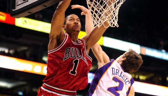 Dans sa deuxième saison, bien avant ses blessures, le meneur était en pleine ascension, au propre comme au figuré. Sur le point d’être nommé All-Star pour la première fois de sa carrière, il va marquer la planète NBA en postérizant Goran Dragic, en début de carrière à Phoenix, qui ne servit que de trampoline à son homologue de Chicago…