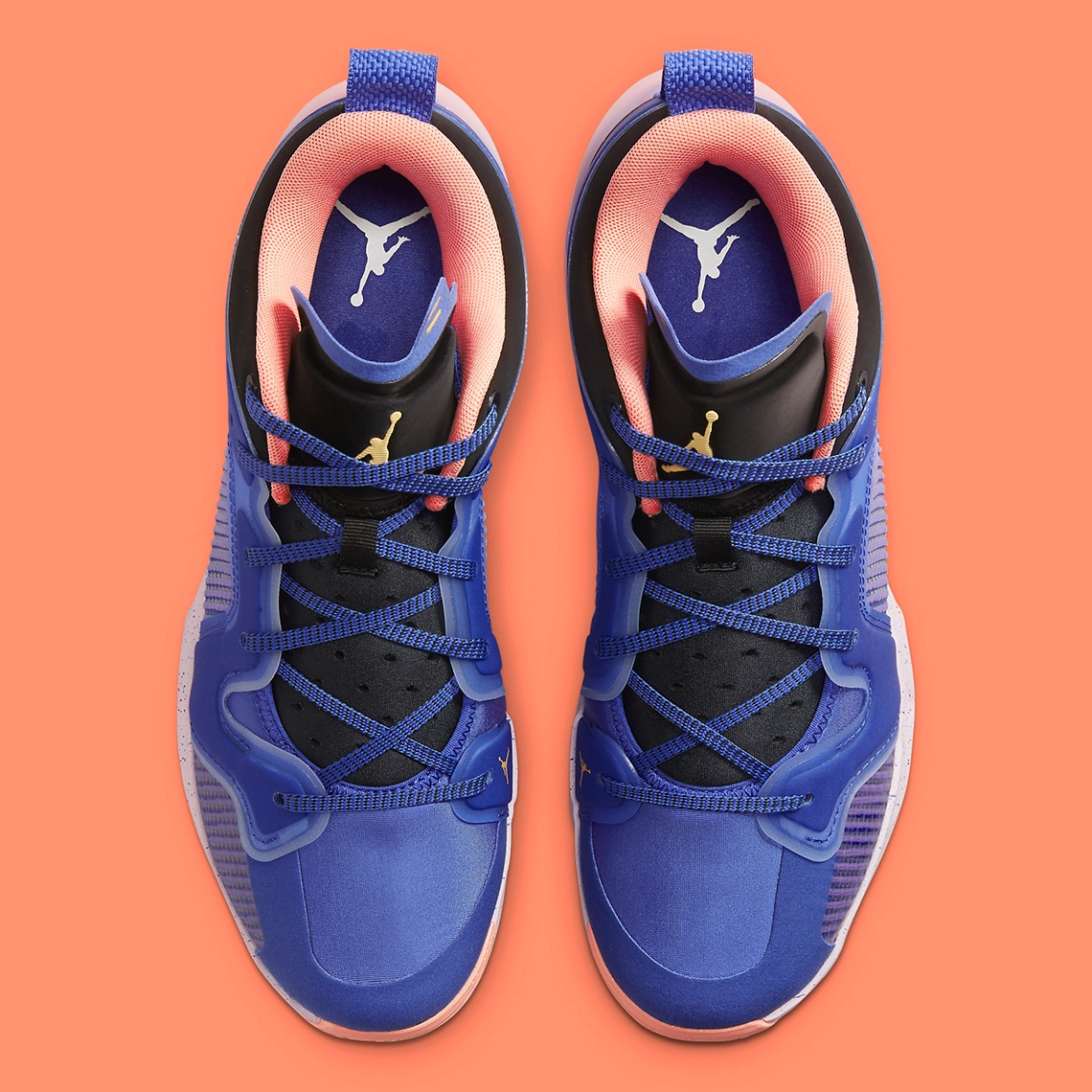 La tige entièrement habillée d’un bleu foncé métallique, avec du noir au niveau du col et de la languette, ainsi que du « saumon » pour l’intérieur du col. Les logos « Jumpman » ressortent en doré, et l’ensemble repose sur une semelle en gris tacheté de bleu et saumon.