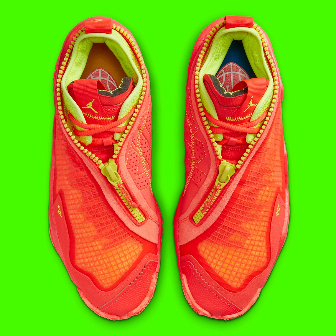 On y voit une tige travaillée en rouge avec une partie arrière visiblement en daim. L’originalité se situe au niveau de la fermeture éclair dont les crans se prolongent autour du col, en jaune fluo. Les finitions tels que le logo du joueur ou le « Jumpman », apparaissent également en jaune. La semelle est elle aussi en rouge et jaune.