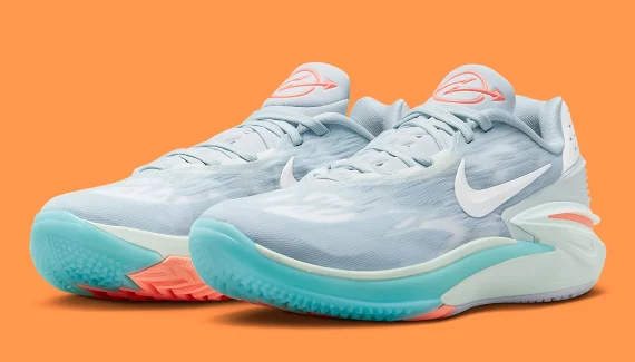 Celui-ci se distingue par les couleurs qui composent sa semelle, entre bleu turquoise, vert pâle et orange pour contraster avec une tige d’un bleu-gris plus classique, ornée d’un « Swoosh » blanc.