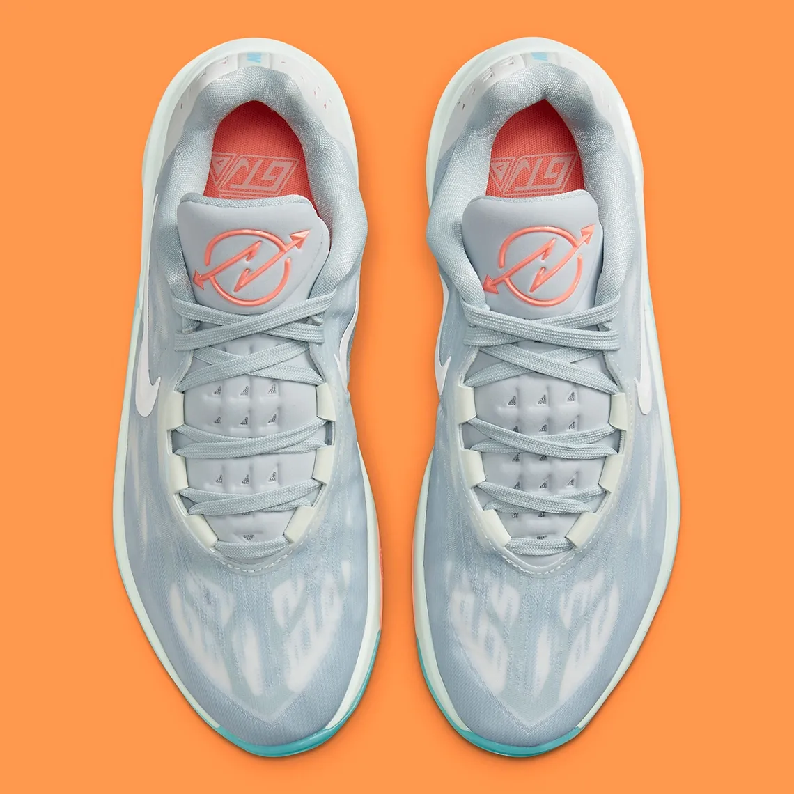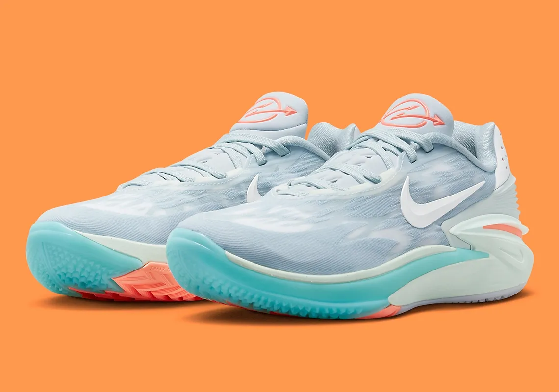 Celui-ci se distingue par les couleurs qui composent sa semelle, entre bleu turquoise, vert pâle et orange pour contraster avec une tige d'un bleu-gris plus classique, ornée d'un « Swoosh » blanc.