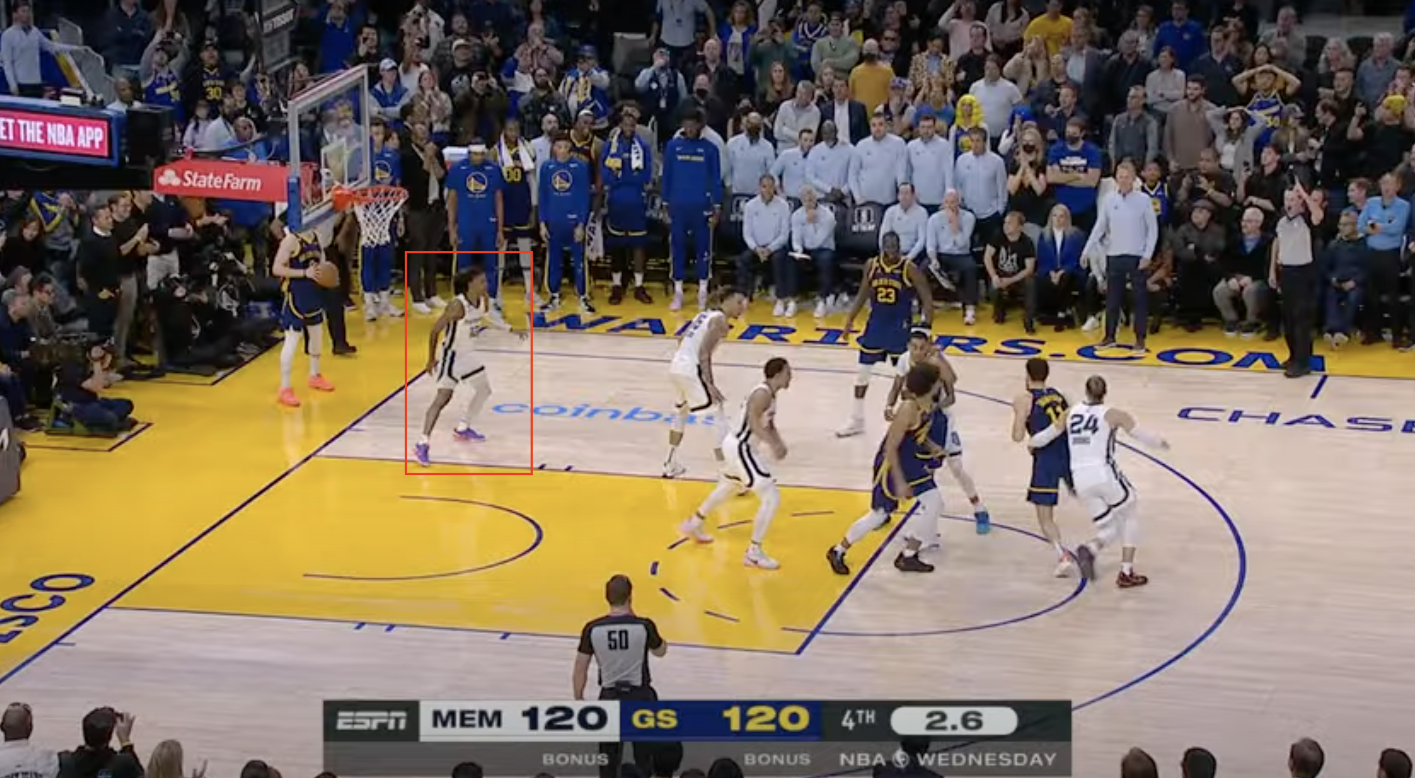 Quand il voit Klay Thompson partir vers le corner, il imite sa course pour le rencontrer à la sortie de l’écran et fermer la passe dans le corner. Dillon Brooks, qui défend sur le “Splash Brother” l’a suivi derrière l’écran pour ne pas lui donner d’espace, et Brandon Clarke, qui défend sur le poseur d’écran, est lui aussi focalisé sur le shooteur. À ce moment-là, les trois joueurs sont sur Klay Thompson et Desmond Bane a suivi Anthony Lamb.