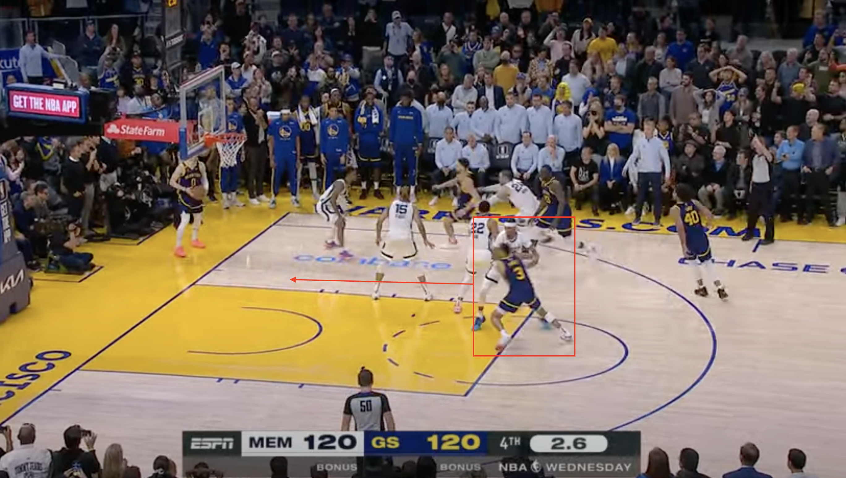 Au lieu d’être positionné entre son joueur, Jordan Poole, et le panier, il est collé à la hanche droite du Warrior. Celui-ci peut alors couper fort vers le cercle quand il voit la défense de Memphis s’orienter vers Klau Thompson.
