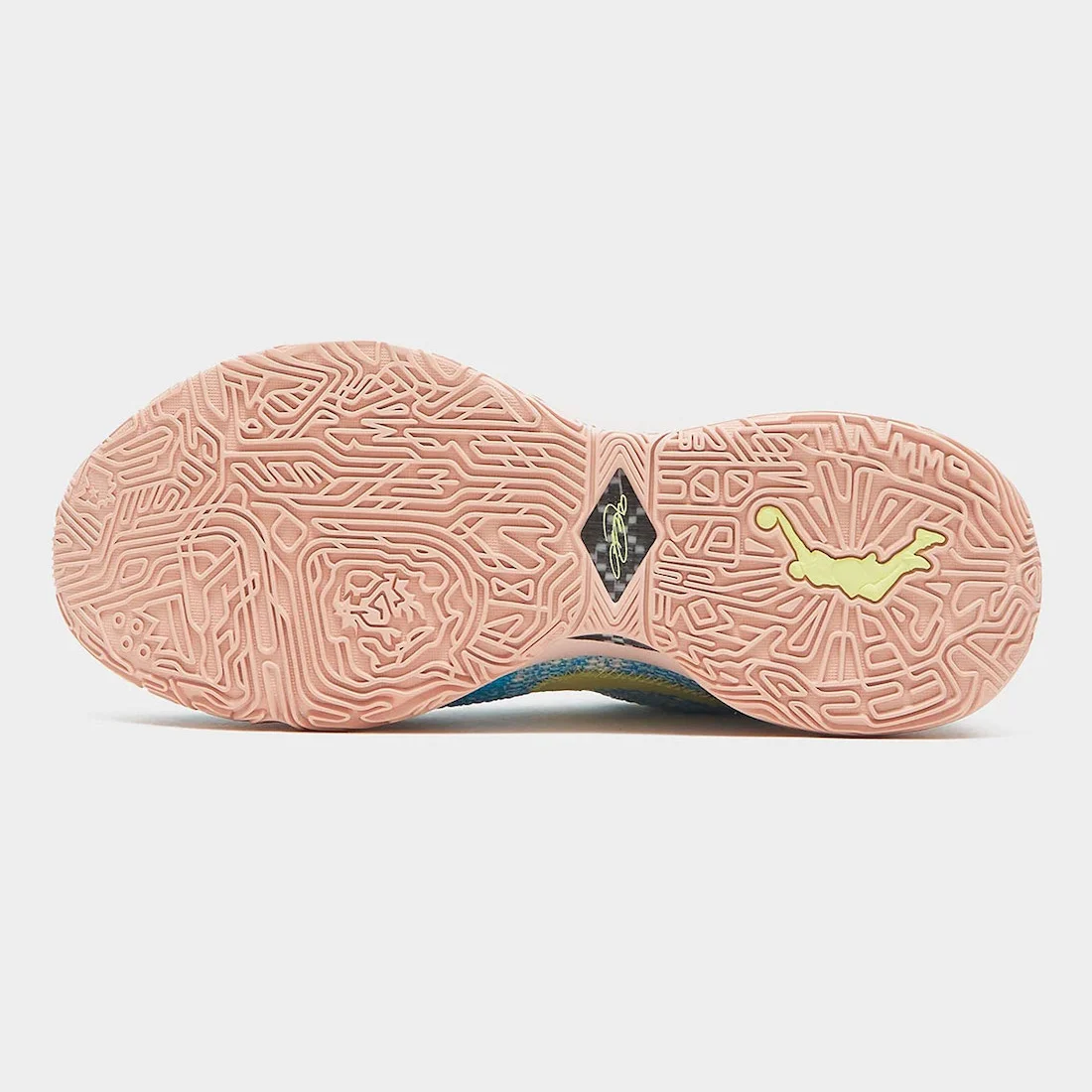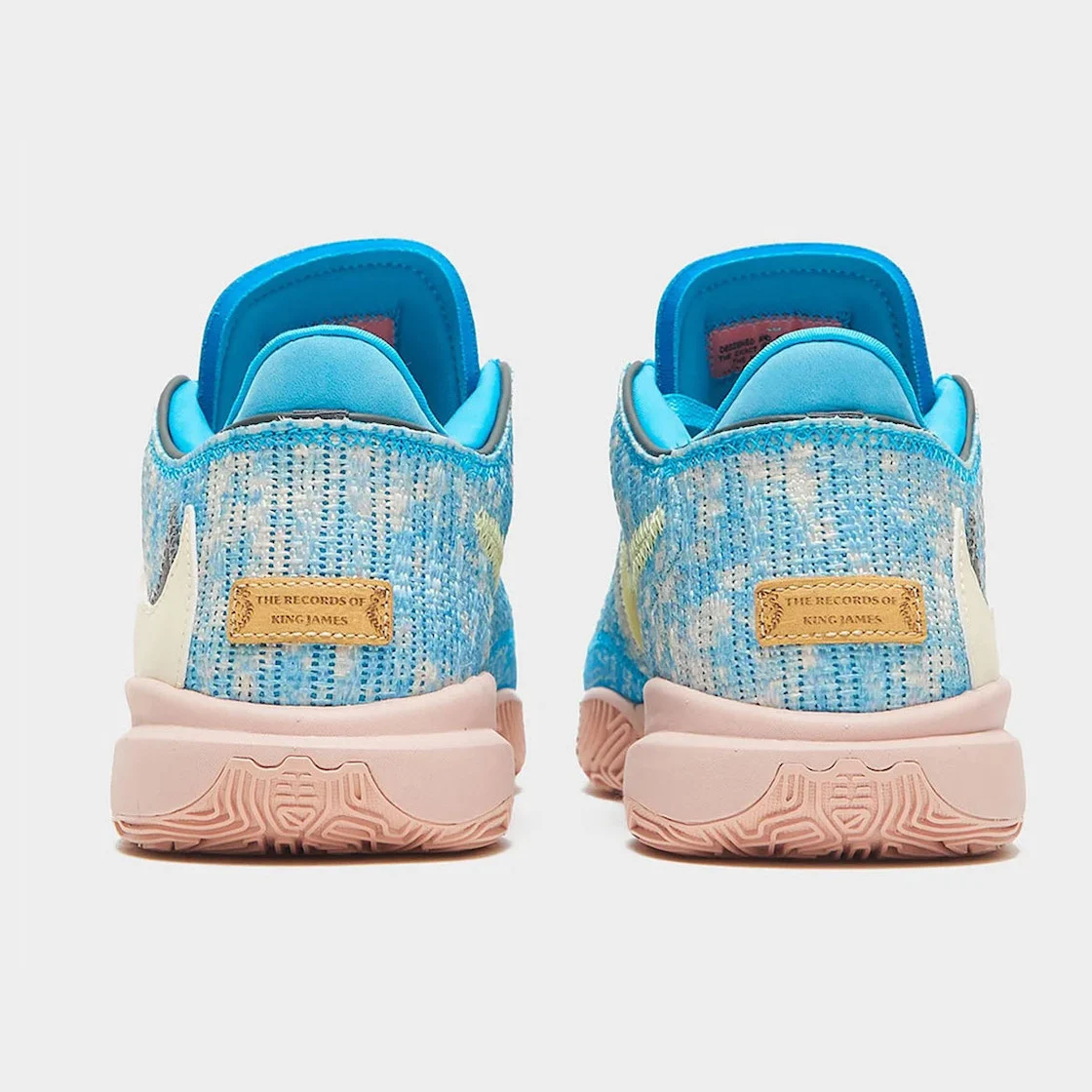 La tige est ornée de bleu clair et blanc, mais la principale originalité réside dans les logos « Swoosh » superposés, qui sont cette fois inversés, en blanc et gris. On retrouve également l’inscription de circonstance « The Records of LeBron James » au niveau du talon. La semelle termine l’ensemble avec du rose pâle.