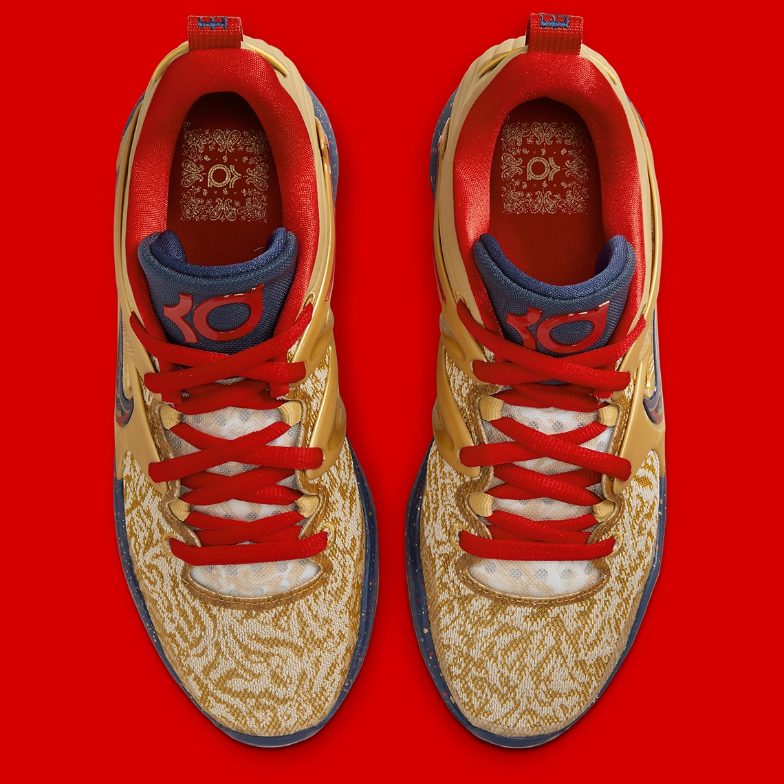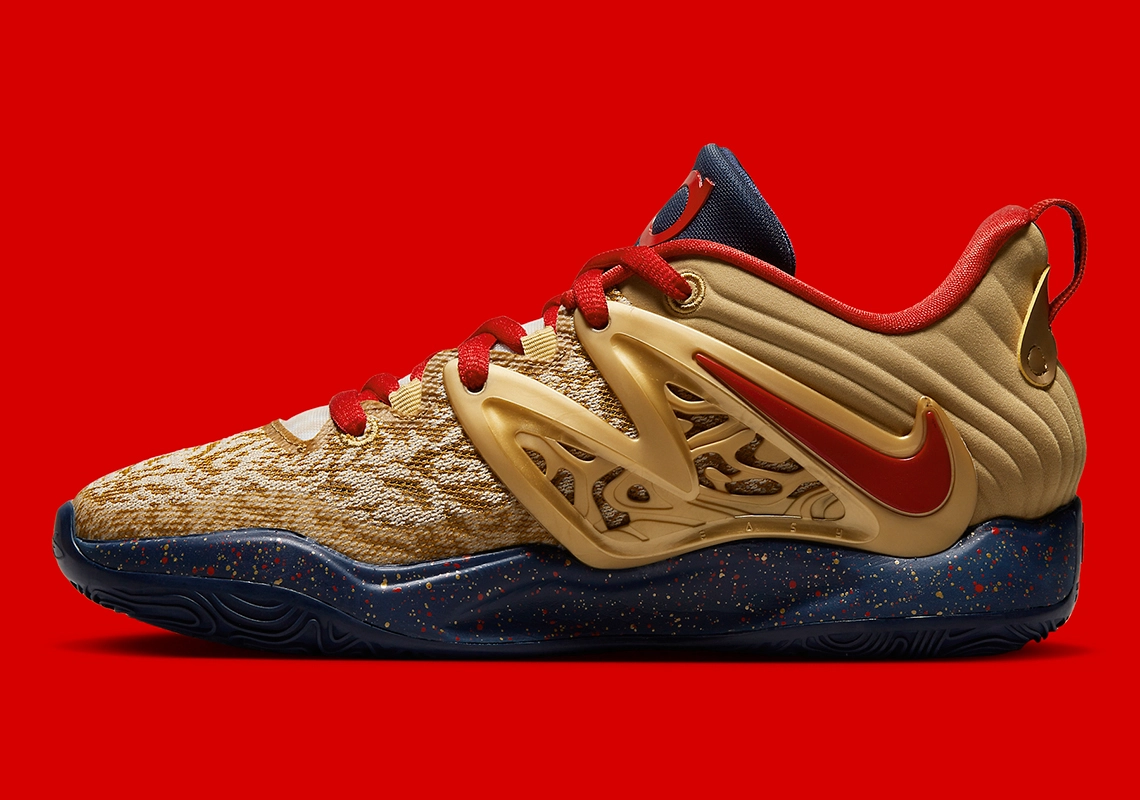 Nike a trouvé une façon originale de mettre à l’honneur la carrière de Kevin Durant avec ce coloris « Olympics », pour rappeler le parcours couronné de succès de KD sur la scène olympique avec trois médailles d’or, à Londres en 2012, Rio en 2016 et Tokyo en 2021.
