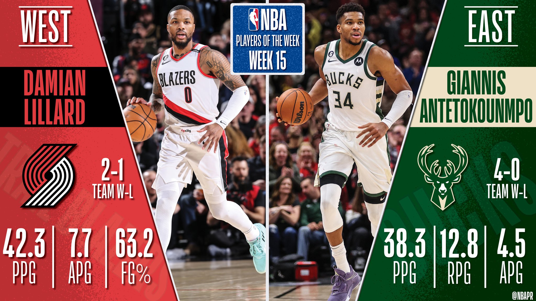 C'est la 15e fois que le meneur de Portland est ainsi désigné “Joueur de la semaine” en NBA alors que c'est la 20e fois pour Giannis Antetokounmpo.