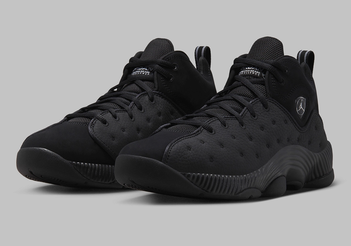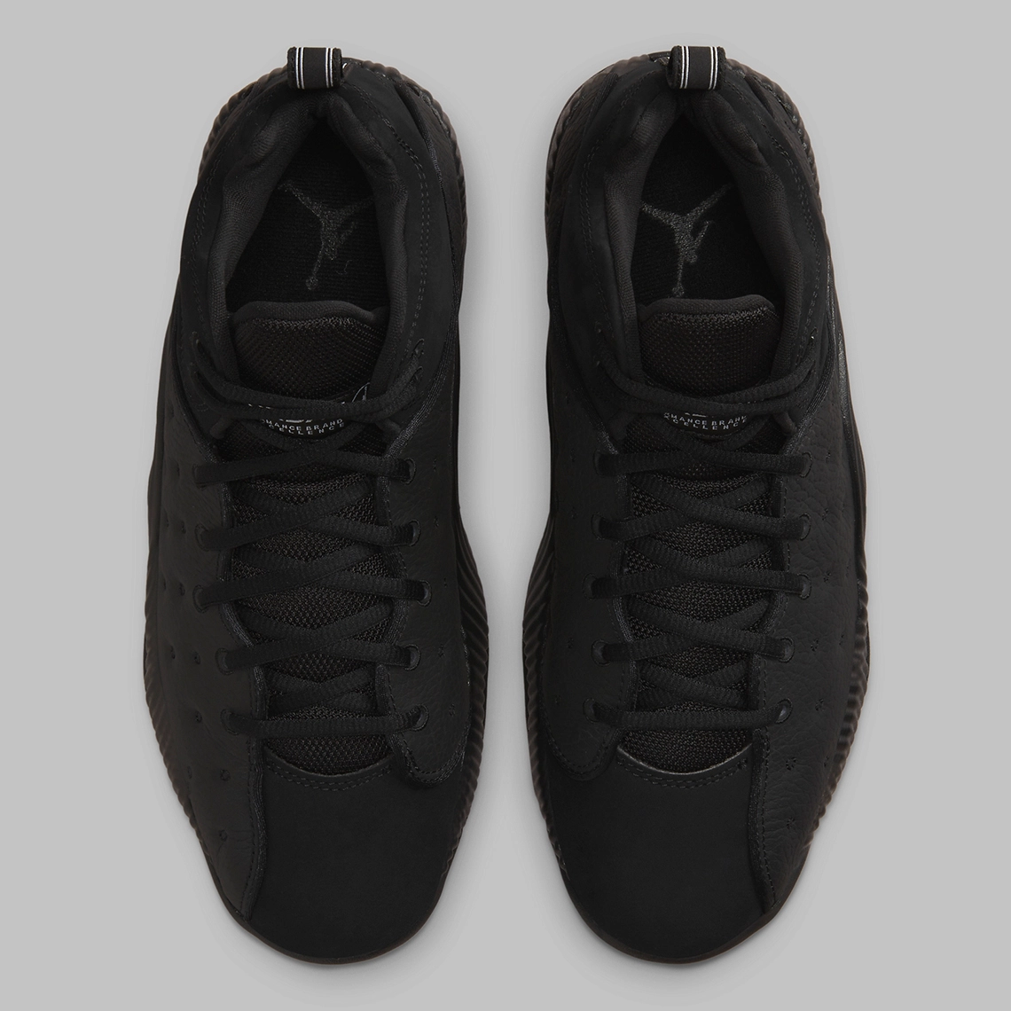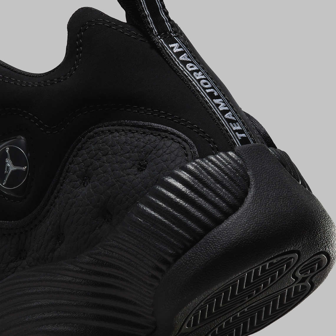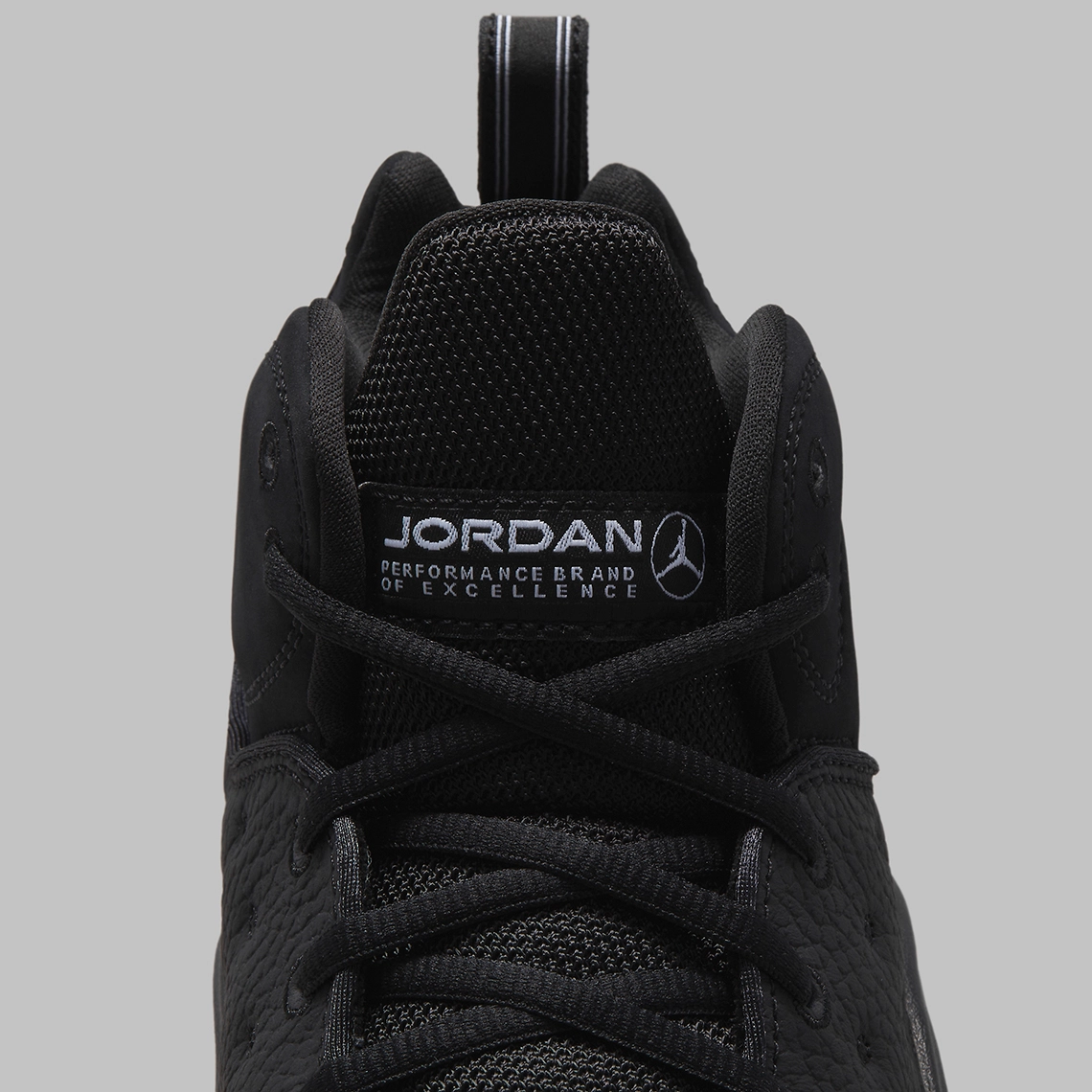 La tige s’habille ainsi de parties en cuir « grainé », de nubuck souple et de mesh entièrement en noir. L’ensemble est doté de finitions en gris, sur le logo « Jumpman » similaire à la AJ 14, le « Team Jordan » au niveau du talon ainsi que l’inscription « Jordan Performance Brand of Excellence ».