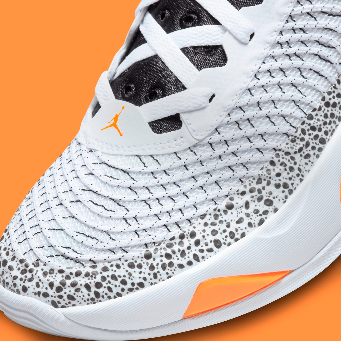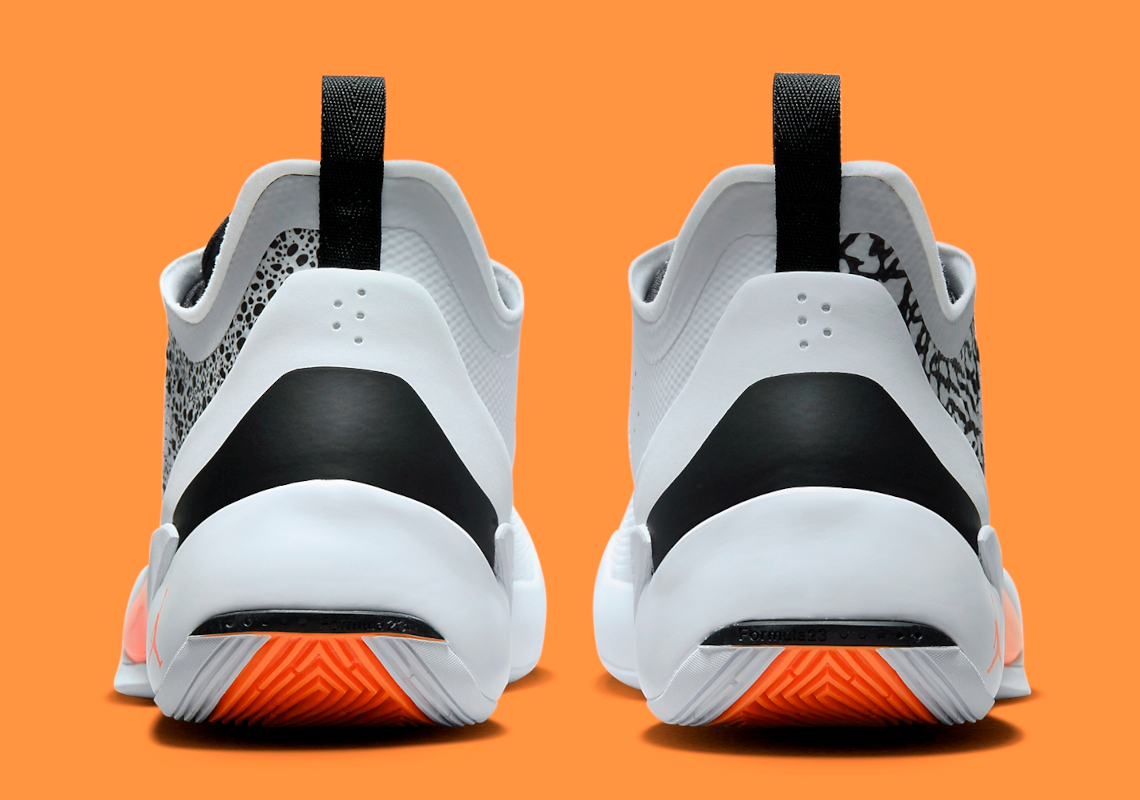 La tige en blanc et noir assez classique se distingue par sa base, avec un imprimé « éléphant » sur la chaussure droite et un imprimé « Safari » sur la chaussure gauche. Les autres finitions ressortent en orange comme les logos et inscriptions ou encore les inserts en TPU sur la semelle.