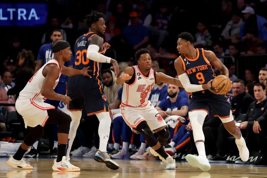 Par exemple en tête de 13 points dans le second quart-temps avant d'être rattrapés au score par le Heat avant la mi-temps, puis de 14 points dans le troisième quart-temps avant de gâcher une seconde fois cette avance. Ou encore, et surtout, de 5 points à une vingtaine de secondes de la fin, avant d'encaisser un tir primé ouvert puis de perdre le ballon sur la possession suivante, offrant ainsi une balle de match à Miami, les Knicks n'ont effectivement pas épargné le rythme cardiaque de leurs fans.