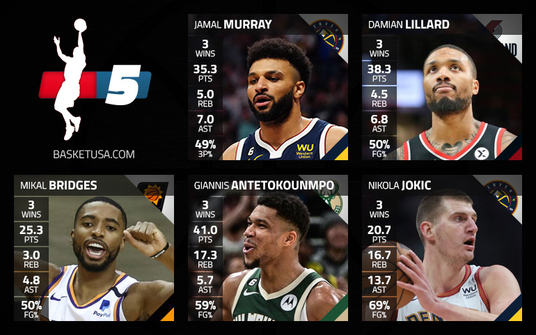 Rien que pour son match à 53 points face à Detroit, Luka Doncic pouvait prétendre à une place dans le cinq de la semaine. Mais le Slovène n’a joué que deux des trois matchs de Dallas, et on préfère donc mettre en avant les performances de Damian Lillard mais aussi d’un Jamal Murray qui semble de retour à son meilleur niveau.