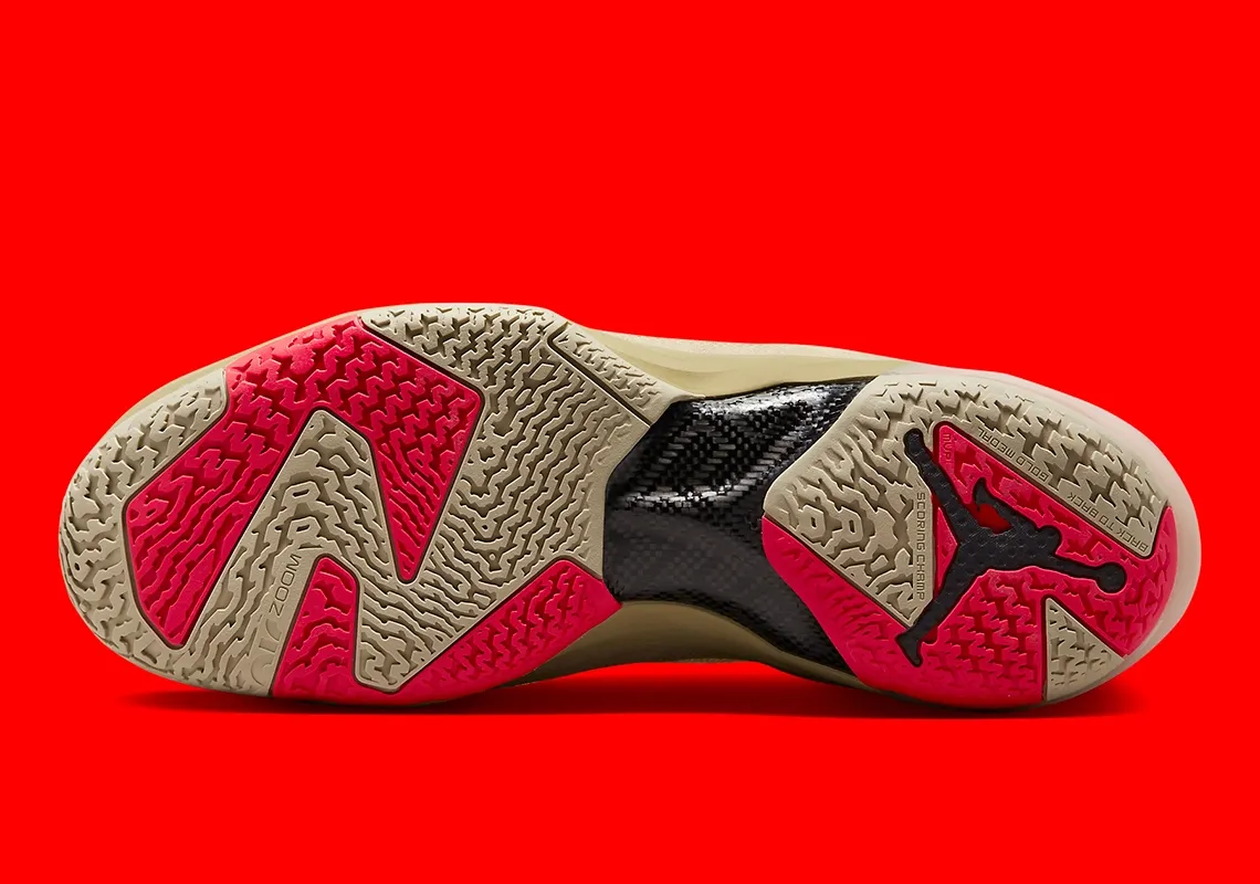 Jordan Brand continue d’explorer les contours de son dernier petit bijou, la Air Jordan 37. Pour cette nouvelle version, la marque au « Jumpman » est partie sur une tige beige assortie de daim à sa base et sur le col, l’ensemble étant rejoint au niveau du talon.
