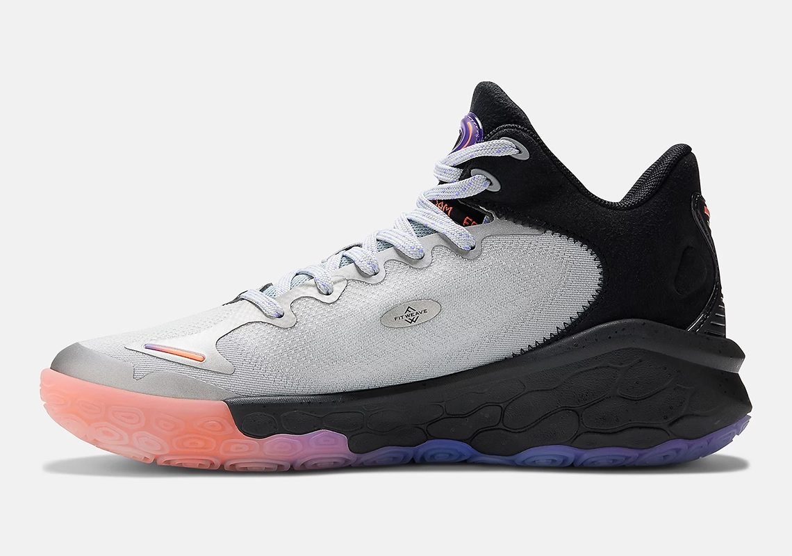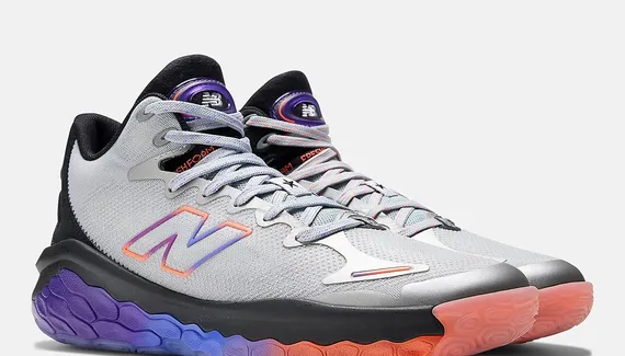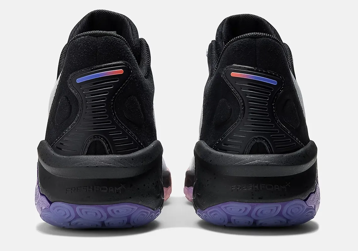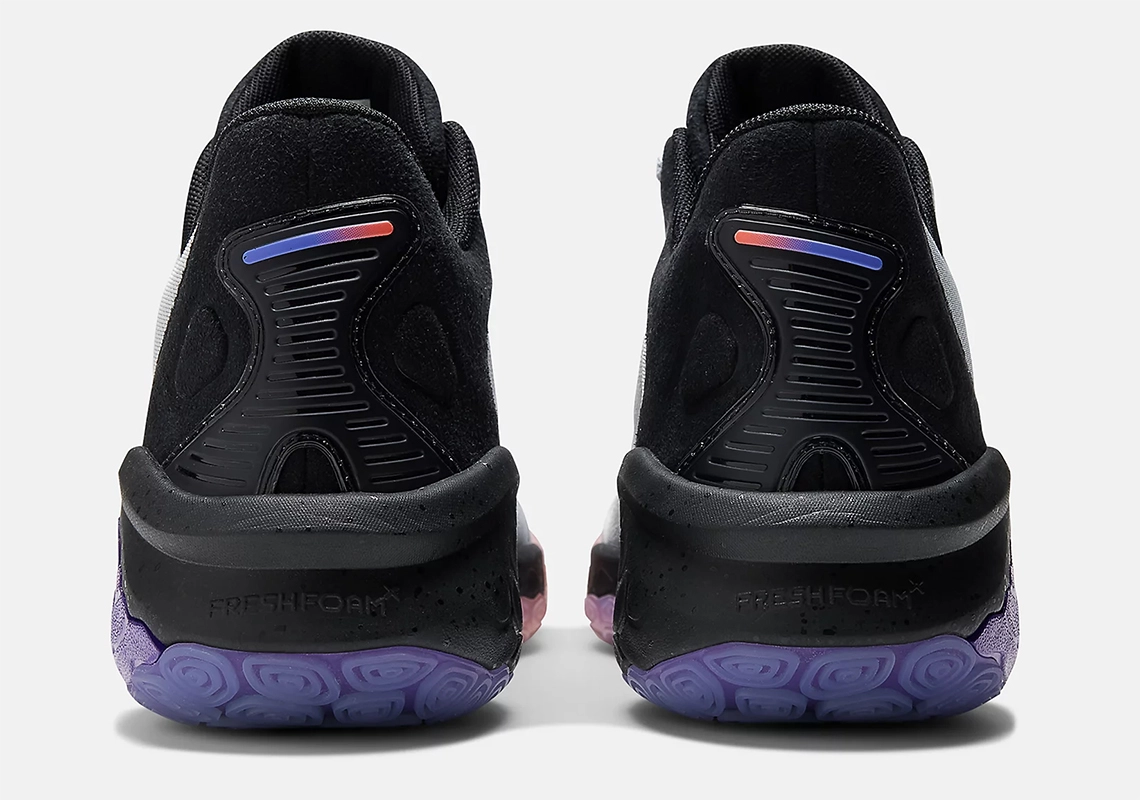 Sa tige FitWeave est associée à une partie arrière en nubuck noir, et l’ensemble repose sur une semelle habillée d’un dégradé allant du violet à l’orange en passant par le bleu. Le même dégradé orne les contours du « N » présent sur l’empeigne et les finitions sur la languette et le talon.