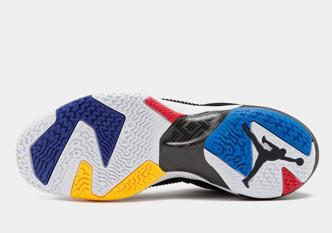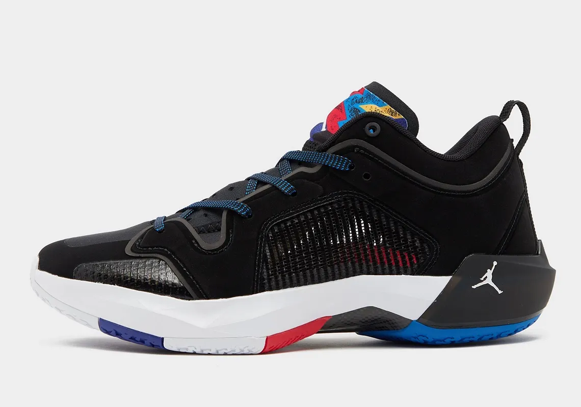 Dans cette publicité, Michael Jordan porte un haut multicolore typique des années 90, et c'est ce coloris qui a servi d'inspiration pour la réalisation de cette dernière Air Jordan 37 Low. Ces motifs sont visibles sur la languette et au niveau de la semelle, complétée par une tige noire assorties de bandes en nubuck.