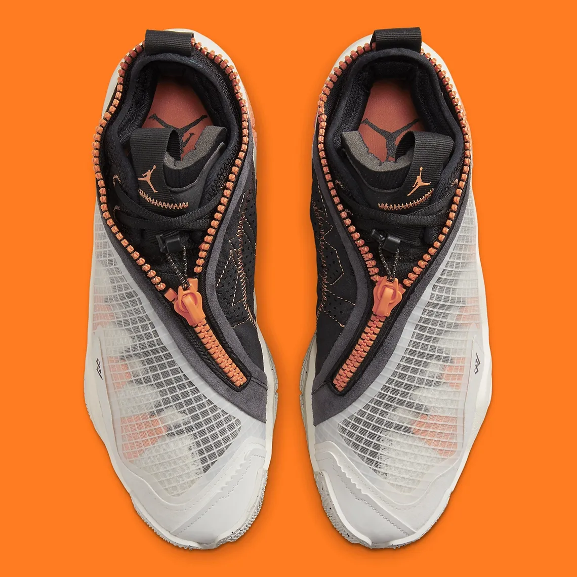 Le premier coloris choisi pour habiller cette nouvelle version au design encore une fois original avait filtré dès début décembre. Il se distingue par sa tige noire et blanche sur la surface, et sous les parties transparentes des accroches en orange pour les lacets. Au niveau du col, le prolongement de la fermeture éclair ressort aussi en orange. La semelle extérieure s’affiche en blanc à l’avant et orange à l’arrière, le revêtement faisant penser à celui d’un ballon de basket.