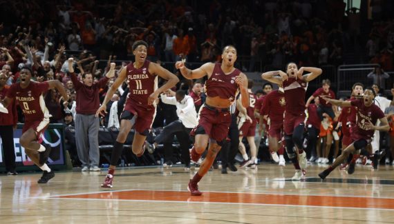 Il y a d’abord ce tir en suspension sur un pied de Matthew Cleveland juste devant le logo du milieu du terrain pour donner la victoire à Florida State sur le parquet du rival Miami (#13), puis cette véritable prière, envoyée depuis sa moitié de terrain juste avant le gong, de Desmond Cambridge Jr. pour offrir la victoire à Arizona State, sur le parquet du rival Arizona (#7).