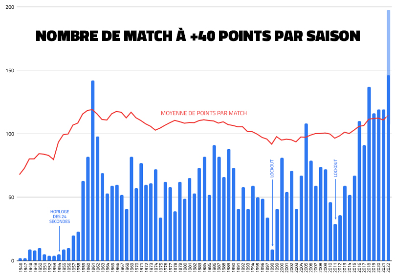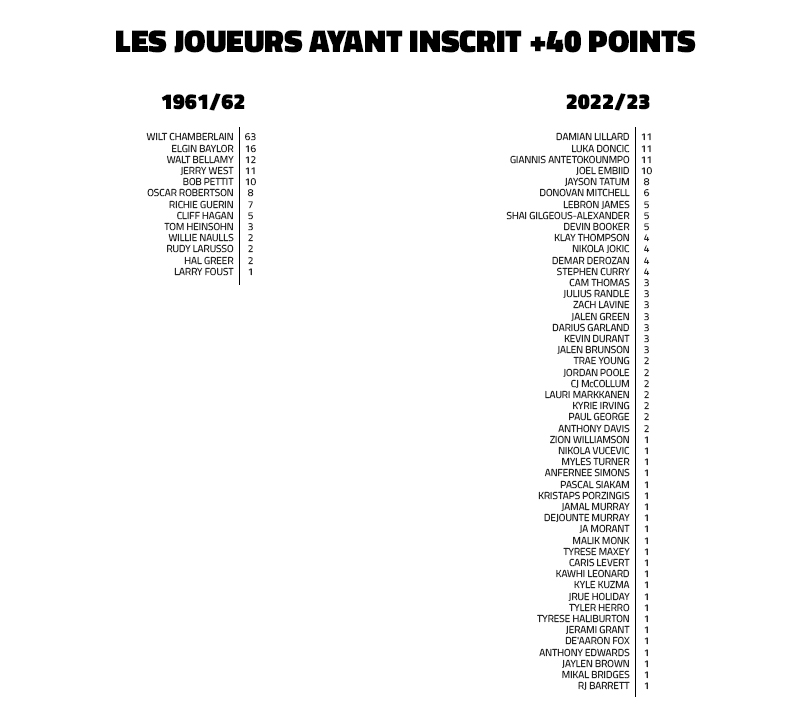 D’autant qu’à la différence de la saison 1961/62, où Wilt Chamberlain avait boosté le total avec ses 63 matchs à plus de 40 points sur la saison (!), mais où seuls 12 autres joueurs avaient atteint cette barre sur un match, il y a cette saison 50 joueurs différents qui l’ont fait, menés par Damian Lillard (11 fois), Luka Doncic (11 fois), Giannis Antetokounmpo (11 fois), Joel Embiid (10 fois) ou encore Jayson Tatum (8 fois).