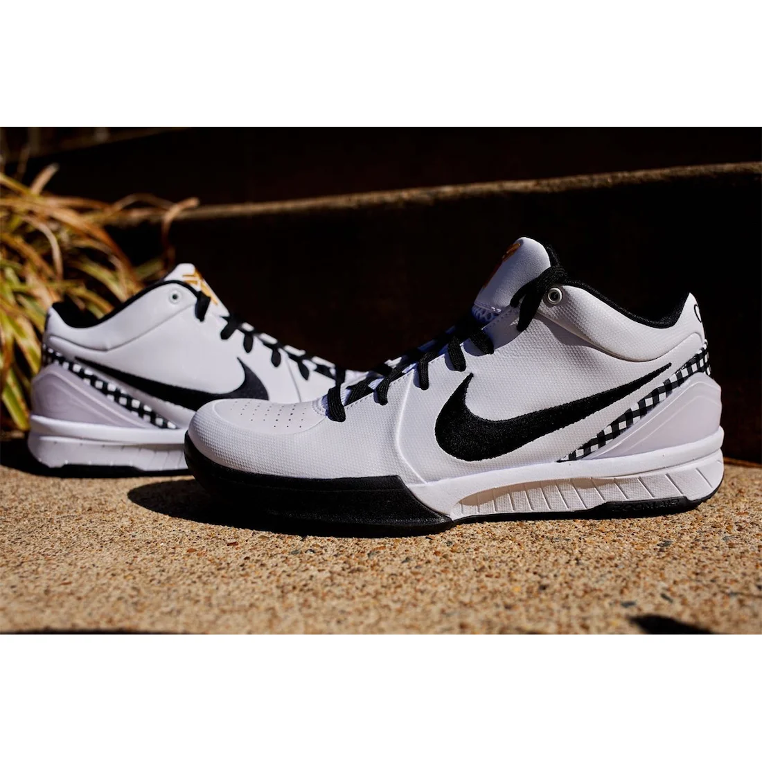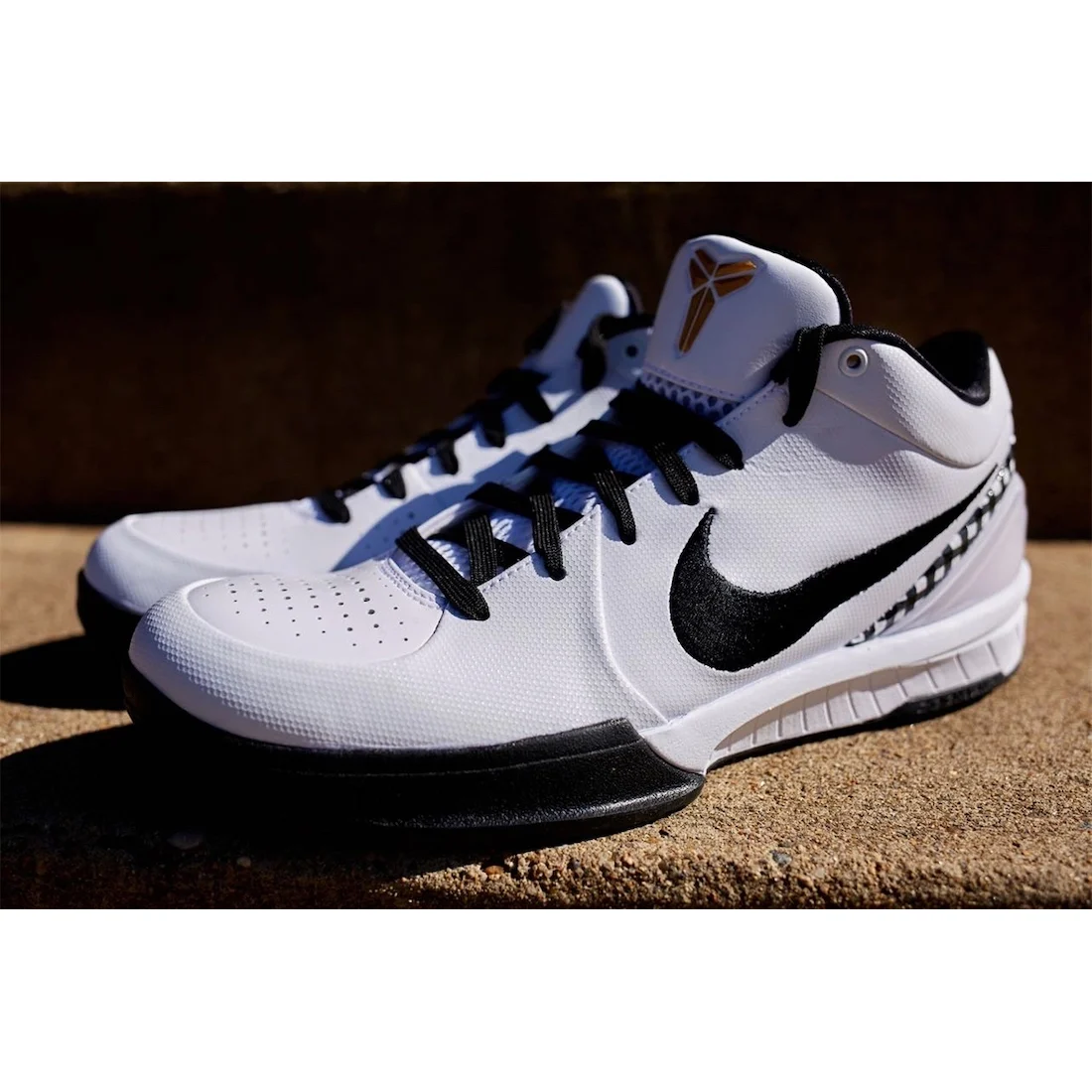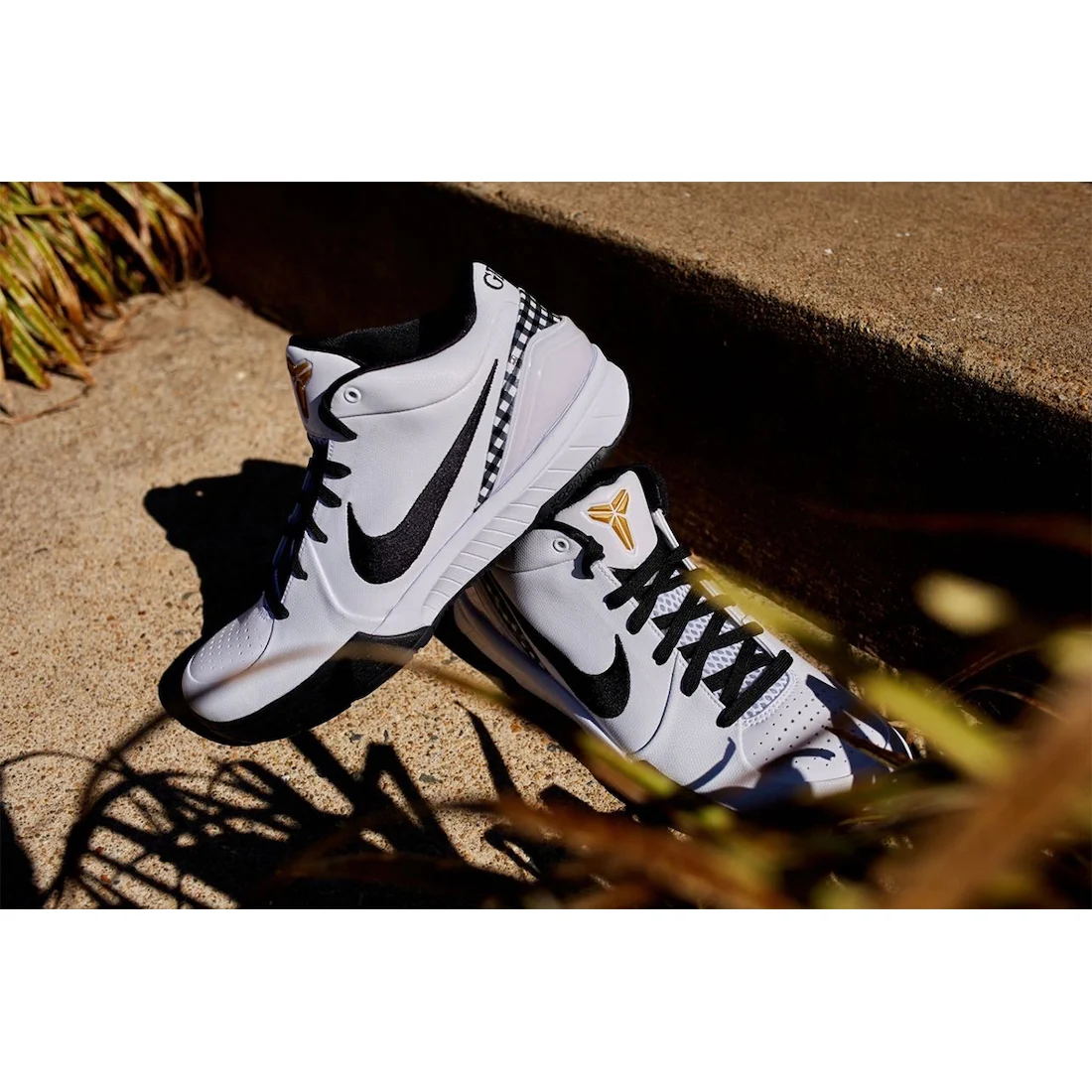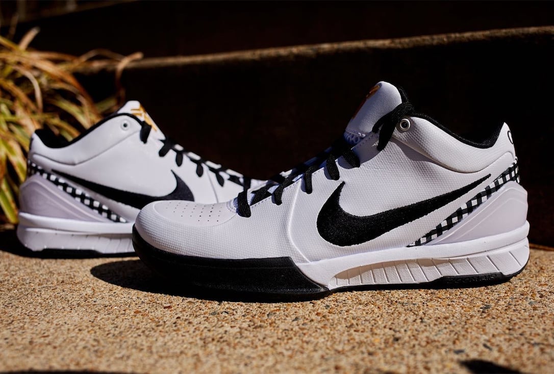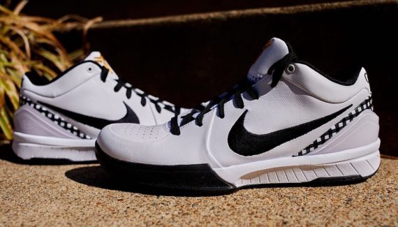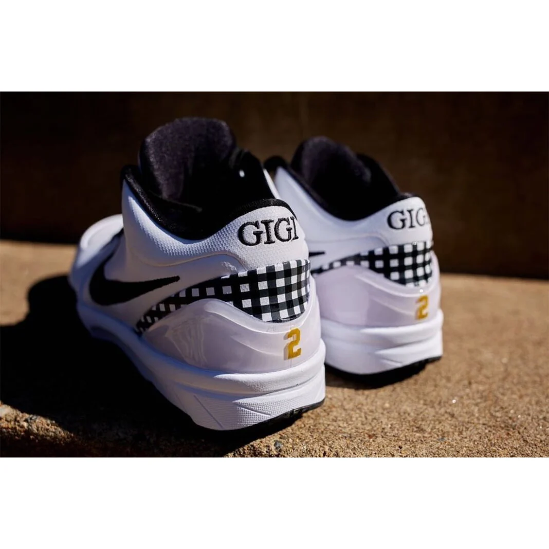 Celle-ci se présente avec une base en cuir blanc et des touches de noir, comme sur la virgule, ou le tissu écossais parcourant le talon. Le logo de Kobe Bryant sur la languette et le numéro 2 portée par Gigi sur le talon ressortent en doré, l’ensemble reposant sur une semelle noire et blanche.