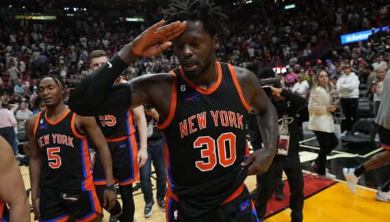 Mais c’est surtout sa fin de match qui compte. Car après avoir joué de son physique et de son adresse toute la soirée, face à Bam Adebayo et Jimmy Butler, l’ailier fort de New York pensait bien avoir scellé la victoire de son équipe sur un “turnaround jumpshot” avec la faute face au pivot adverse. Il y avait alors 119-116 pour New York alors qu’on rentrait dans la dernière minute de cette rencontre en Floride.