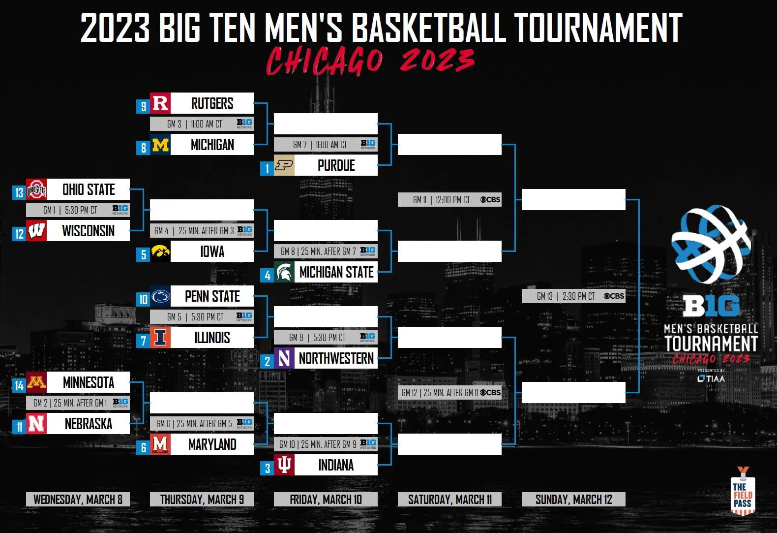 Champions de la saison régulière, les Boilermakers de Zach Edey sont clairement les favoris pour gagner ce tournoi. Premiers, ils affronteront en quart-de-finale la vainqueur du barrage entre Michigan (#8) et Rutgers (#9), avant une probable demi-finale contre Michigan State (#4) ou Iowa (#5), si la logique hiérarchique est respectée aux tours précédents.