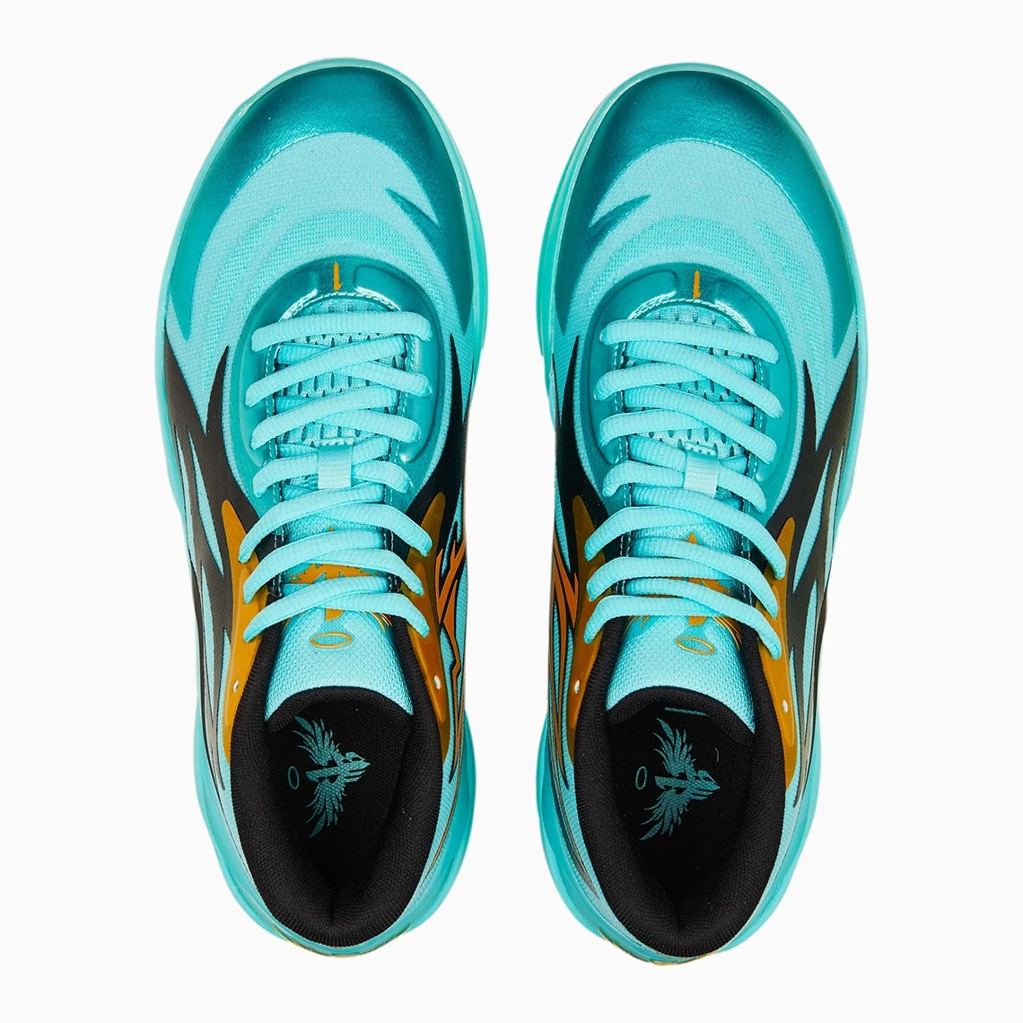 La semelle et la tige sont principalement turquoises, l’ensemble est agrémenté de notes dorées, sur le logo présent sur la languette ou le « 1 » figurant au bas des lacets. Le col ainsi que les contours des motifs présents sur l’empeigne apparaissent pour leur part en noir.