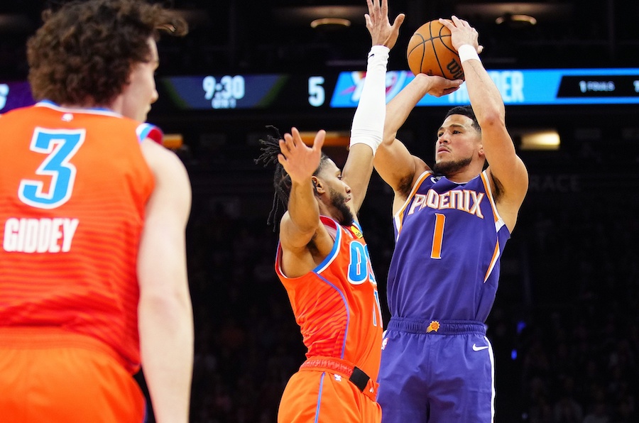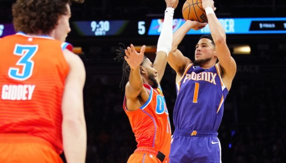 Lorsque TJ Warren s’est présenté à la table de marque, Devin Booker a fait mine de ne pas le voir pour espérer ne pas être remplacé. Son équipe avait déjà plus de 30 points d’avance en ce milieu de quatrième quart-temps face au Thunder, mais l’arrière, ovationné comme il se doit par le public des Suns, avait visiblement envie de poursuivre son chantier.