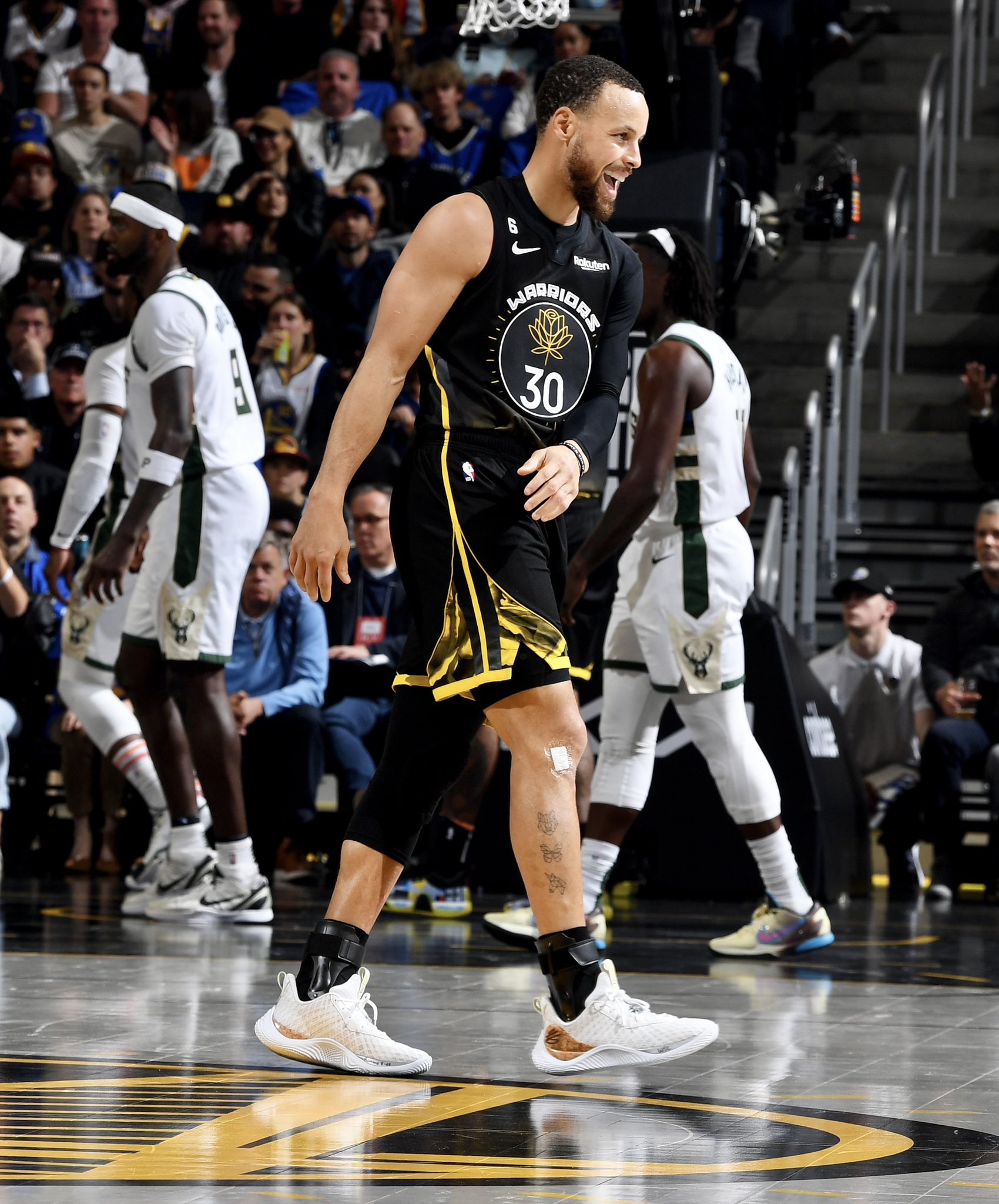 Comme on le disait de Kobe Bryant, on peut dire que Stephen Curry est comme le bon vin car il s’améliore avec le temps. Héroïque dans la victoire en prolongation des Warriors face aux Bucks samedi soir, il s’est notamment distingué par un contre décisif sur Jrue Holiday, mais aussi par les chaussures qu’il portait aux pieds ce soir-là.