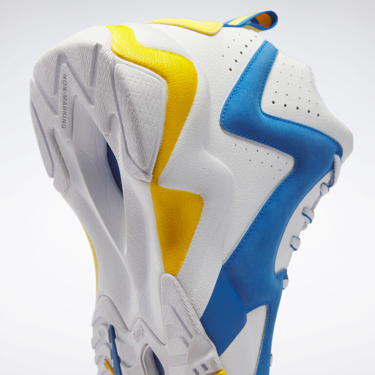 La tige est composée d’une base en cuir blanc traversée par une bande en daim bleu. Les finitions en jaune sur le le talon et la semelle offrent à l’ensemble la teinte UCLA telle que représentée sur le maillot de l’université californienne.