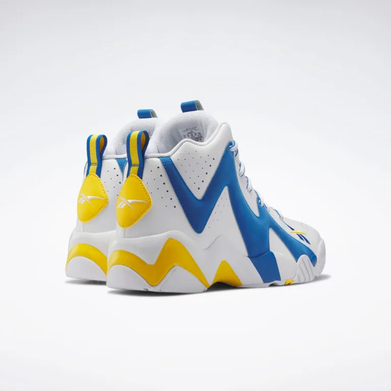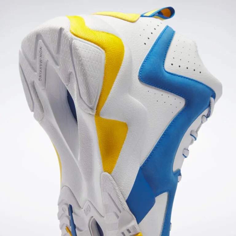La tige est composée d'une base en cuir blanc traversée par une bande en daim bleu. Les finitions en jaune sur le le talon et la semelle offrent à l'ensemble la teinte UCLA telle que représentée sur le maillot de l'université californienne.