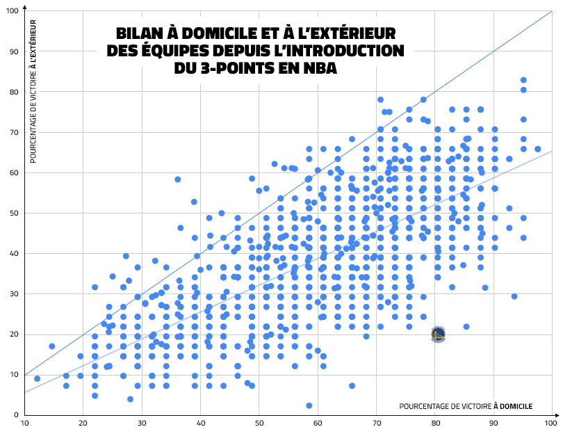 Si on représente tous les bilans en NBA depuis l’introduction du 3-points en 1979, on voit ainsi que les équipes gagnent globalement un tiers de matchs en moins à l’extérieur. On voit également qu’il est extrêmement rare pour une équipe d’afficher un meilleur bilan à l’extérieur (au-dessus de la ligne bleue) qu’à domicile.