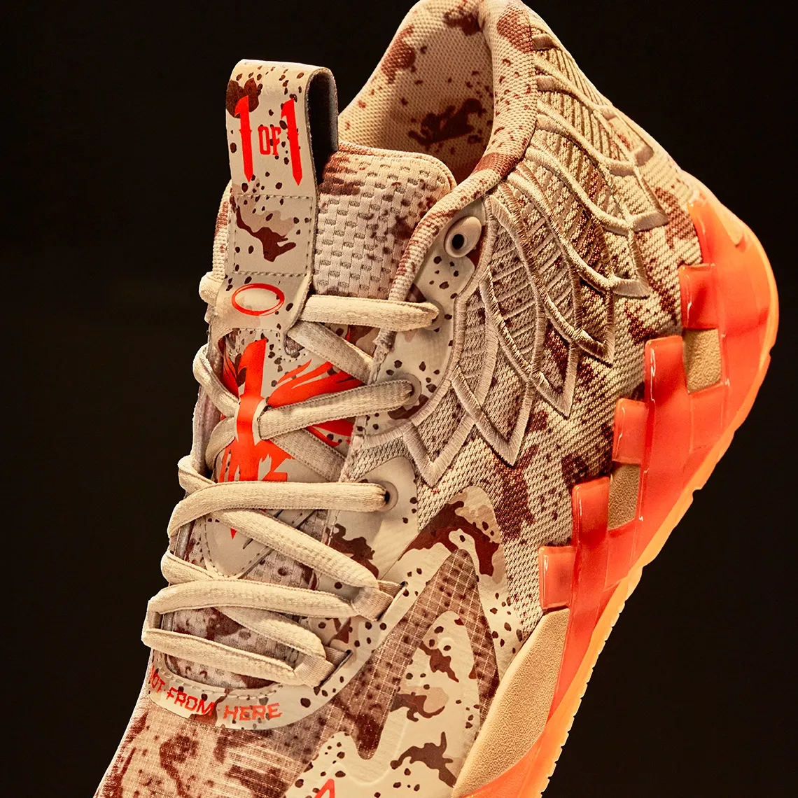Alors que les modèles similaires attendent en général des années avant de réinvestir le marché, ce nouveau coloris s'apprête à replacer la MB.01 au cœur de l'attention. L'empeigne est habillée d'un « imprimé camouflage numérisé » alternant entre beige et marron. Des finitions apparaissent en orange pour faire ressortir les différents logos notamment. La semelle extérieure est également en orange. La bonne nouvelle, c'est que d'autres coloris “PE” (Players Exclusive) portés par LaMelo Ball la saison dernière devraient suivre.