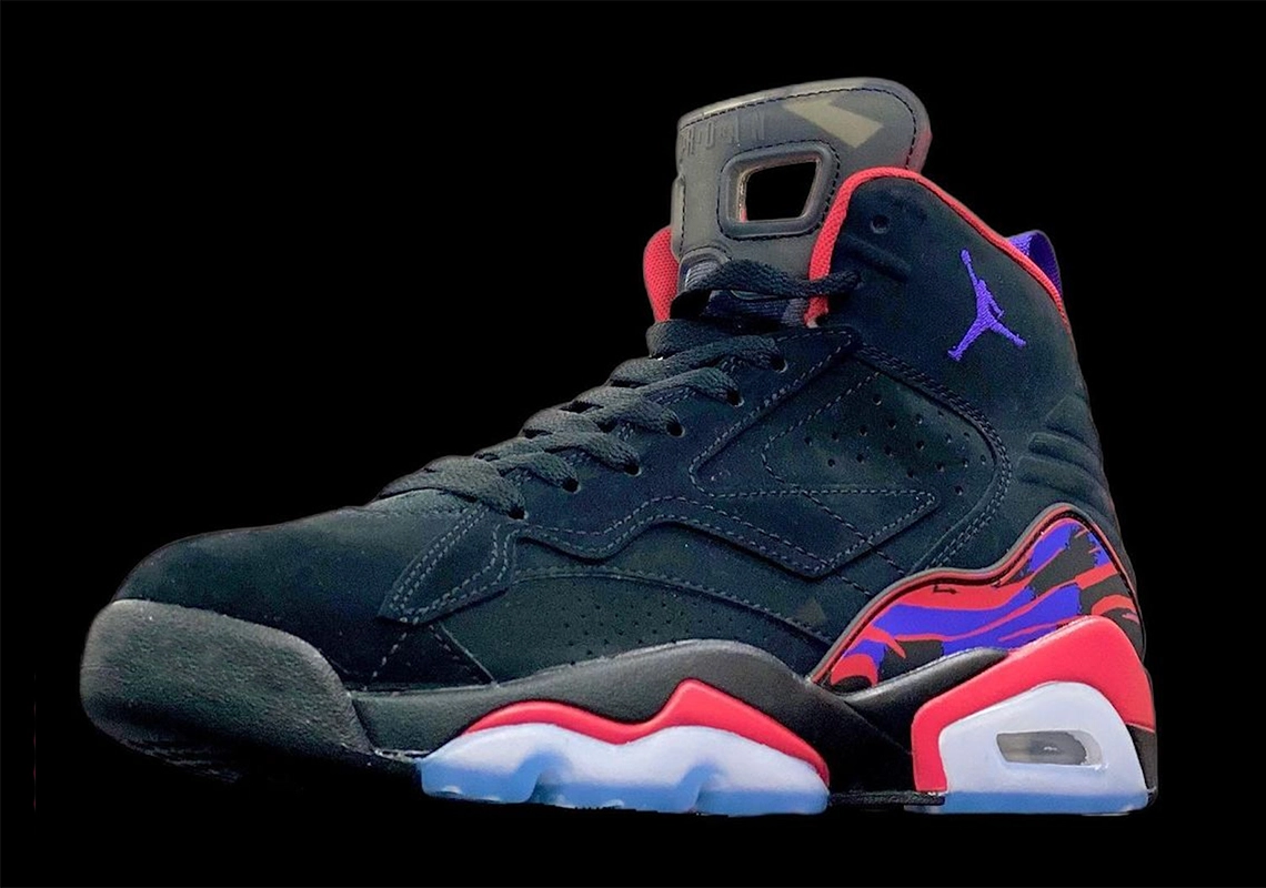 On commence cette fois par la semelle en noir, rouge et bleu translucide, issue de la AJ6. Le clin d’œil à la AJ 7 est présent sur la languette, et l’arrière de la chaussure est inspirée de la AJ8, la tige reprenant habilement des touches des trois paires. Ce coloris principalement noir assorti de finitions en violet et rouge devrait être le premier à sortir, probablement au cours de l’été. Son prix devrait avoisiner les 240 dollars.