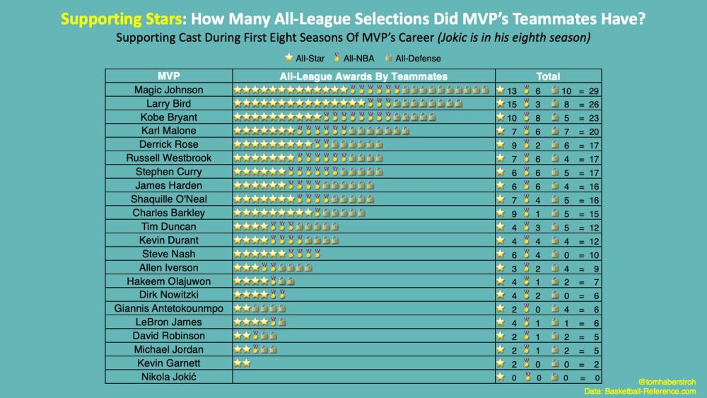 En moyenne, on remarque qu’un MVP (ou futur MVP) est entouré par 12 sélections All-Star, All-NBA ou All-Defensive dès ses huit premières saisons en NBA. Cela va du 29 de Magic Johnson, qui les devait évidemment beaucoup à Kareem Abdul-Jabbar, au zéro pointé de Nikola Jokic donc, cruellement esseulé à ce niveau chez les Nuggets.
