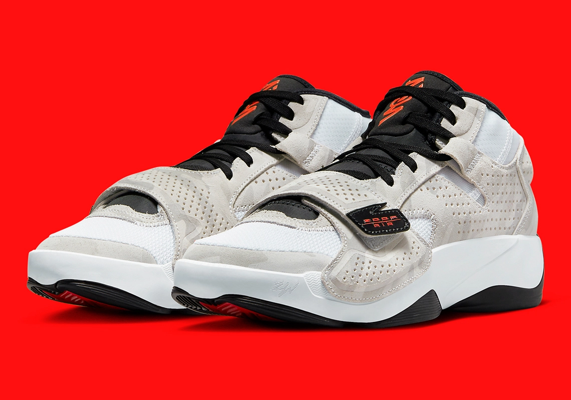 La base de la tige blanche est recouverte de motifs en camouflage clairs, aux tons gris, avec des parties en daim et en nubuck. Les finitions au niveau du col et de la languette ressortent en noir, et les logos en rouge-orange. L’ensemble repose sur une semelle blanche, noire et rouge.