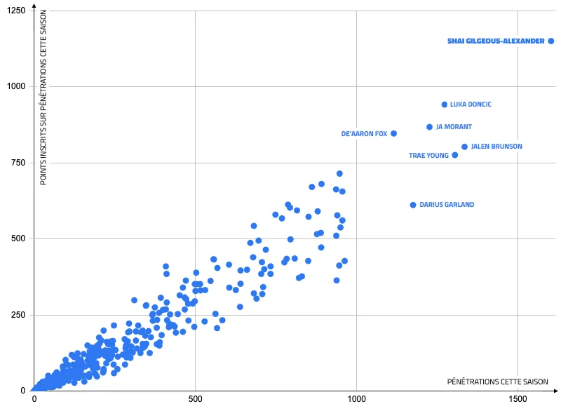 Derrière Shai Gilgeous-Alexander, c'est d'ailleurs toute l'équipe qui est celle qui “drive” le plus, avec 64.2 pénétrations par match en moyenne, loin devant les Pacers, deuxièmes (55.8). Sachant que la moyenne est de 47.1 pénétrations par match cette année, ça montre bien la spécificité du jeu d'Oklahoma City.