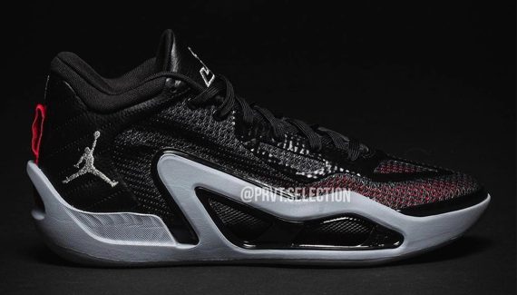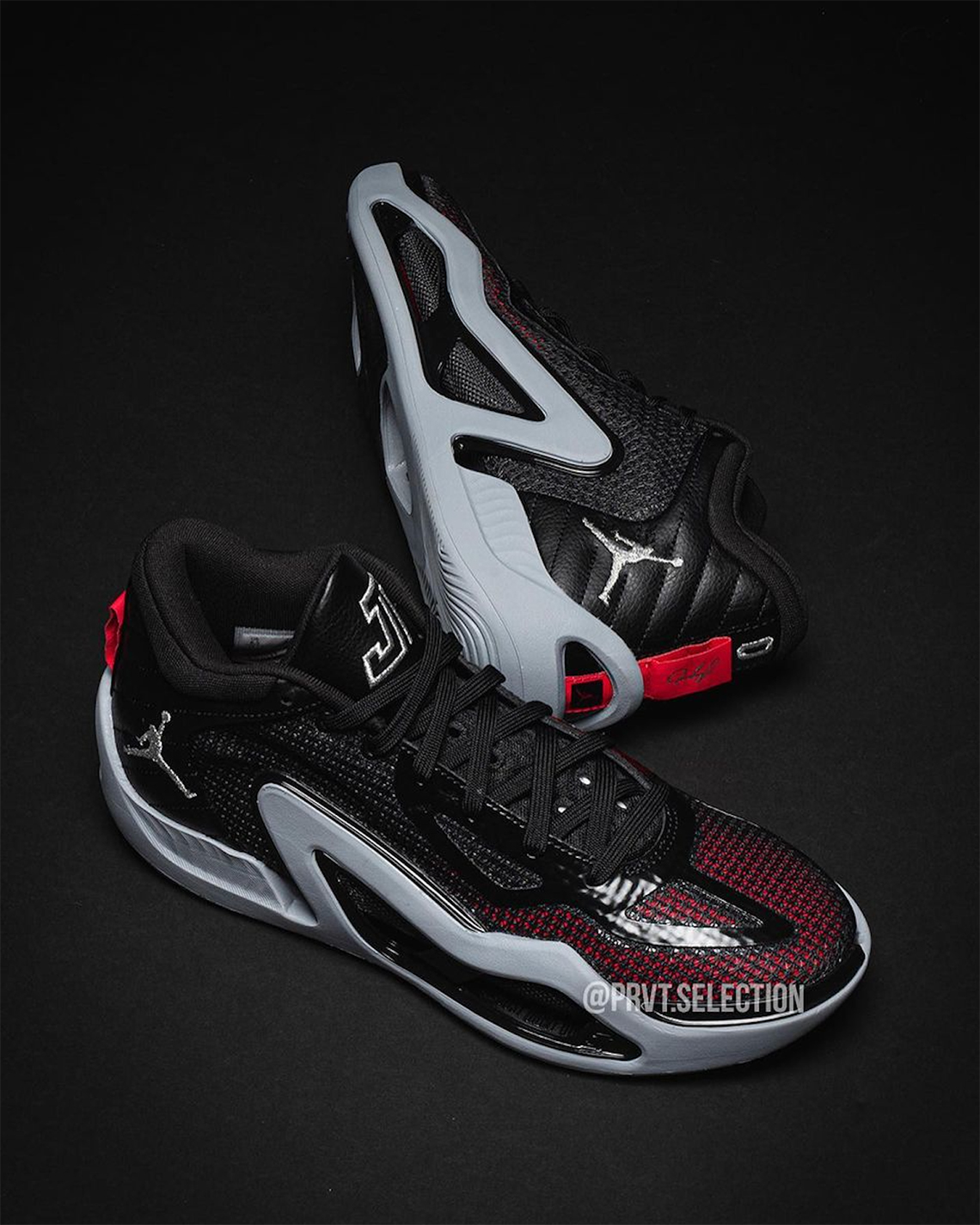 La tige en noir laisse ressortir des compléments en rouge à l’avant du pied, tout comme sur la languette présente sur le talon où figure la signature de Jayson Tatum. Les logos du joueur et de la marque au « Jumpman » apparaissent en gris métal, l’ensemble reposant sur une mousse grise en guise de semelle.
