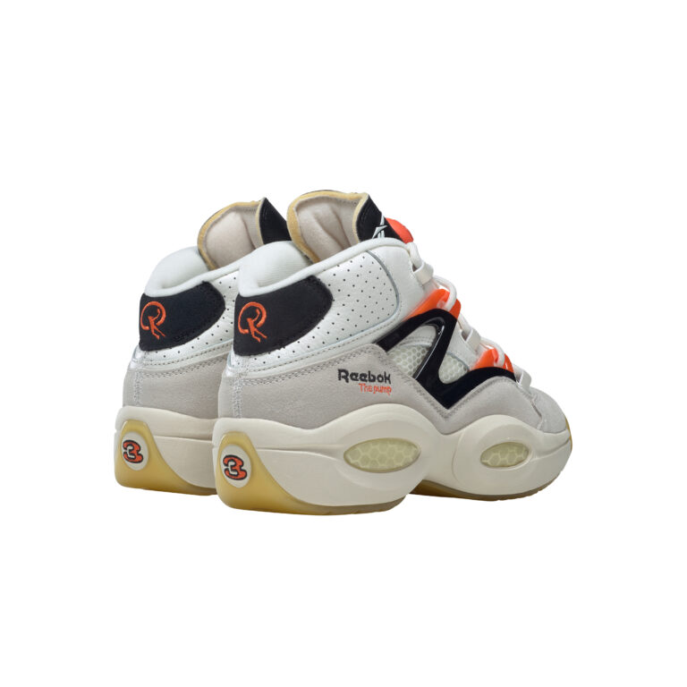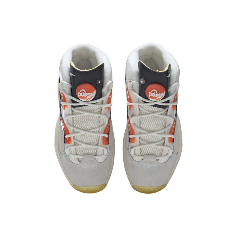 Sur ce nouveau coloris, les couleurs ont simplement été inversées par rapport au précédent. On retrouve donc une tige en mesh blanc assortie de bandes en daim gris à sa base, avec des finitions en noir et orange sur l’empeigne, le haut du talon et la languette sur laquelle figure le fameux « Pump ».