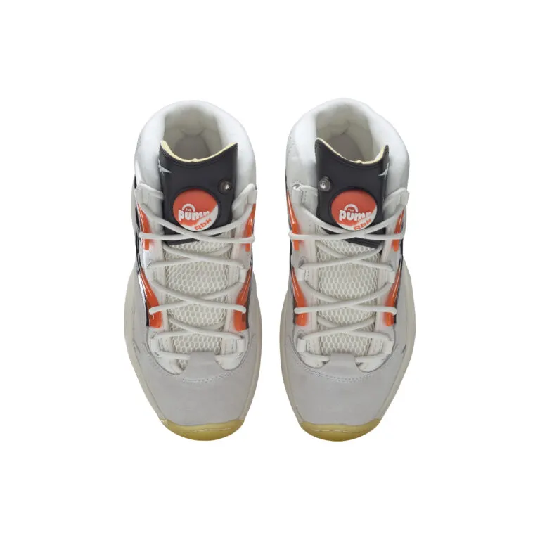Sur ce nouveau coloris, les couleurs ont simplement été inversées par rapport au précédent. On retrouve donc une tige en mesh blanc assortie de bandes en daim gris à sa base, avec des finitions en noir et orange sur l'empeigne, le haut du talon et la languette sur laquelle figure le fameux « Pump ».
