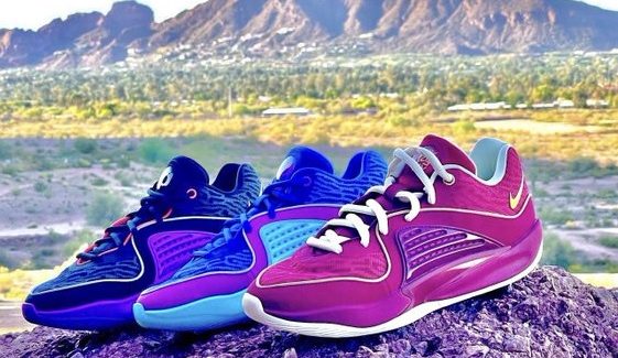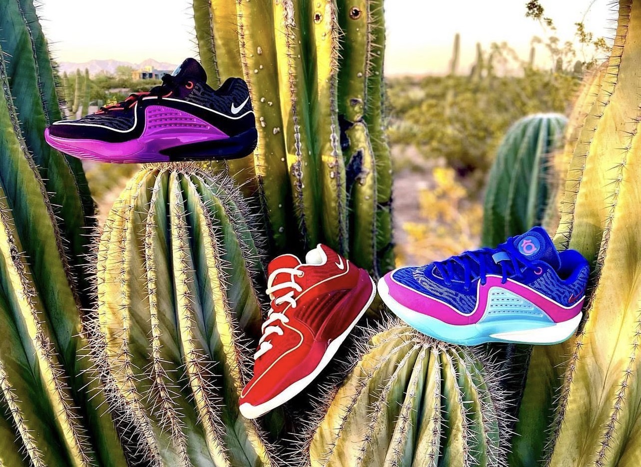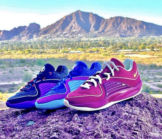 On distingue une tige assez différente du modèle précédent, déclinable en trois parties comme sur le coloris aux tons bleu et violet. Deux autres coloris ont également été présentés dans un décor digne de l’Arizona, où évolue désormais Kevin Durant, avec une paire en rouge et blanc et une autre en noir, violet et blanc.
