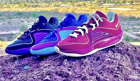 On distingue une tige assez différente du modèle précédent, déclinable en trois parties comme sur le coloris aux tons bleu et violet. Deux autres coloris ont également été présentés dans un décor digne de l'Arizona, où évolue désormais Kevin Durant, avec une paire en rouge et blanc et une autre en noir, violet et blanc.