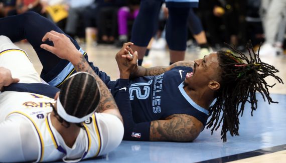 Mais non seulement le meneur a été sanctionné d’une faute offensive sur Anthony Davis mais il n’a pas pu assurer sa réception, retombant assez violemment sur le sol. Son poignet et sa main droite n’ont pas été épargnés dans sa chute, et Ja Morant a été contraint de sortir dans la foulée, visiblement en souffrance.